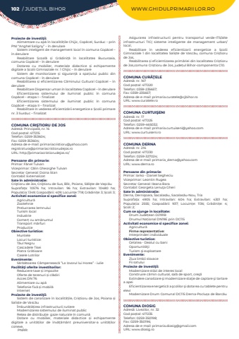 102 / JUDE%u021aUL BIHOR WWW.GHIDULPRIMARIILOR.ROProiecte de investi%u0163ii:Alimentare cu ap%u0103 %u00een localit%u0103%u021bile Chijic, Cop%u0103cel, Surduc %u2013 prin PNI %u201cAnghel Saligny%u201d %u2013 %u00een derulareSistem inteligent de management local %u00een comuna Cop%u0103cel %u2013 %u00een derulareReabilitare %u0218coal%u0103 %u0219i Gr%u0103dini%u021b%u0103 %u00een localitatea Bucuroaia, comuna Cop%u0103cel %u2013 %u00een derulareDotarea cu mobilier, materiale didactice %u0219i echipamente digitale a %u0218colii Gimnaziale nr. 1 Chijic %u2013 %u00een derulareSistem de monitorizare %u0219i siguran%u021b%u0103 a spa%u021biului public din comuna Cop%u0103cel %u2013 %u00een derulareReabilitarea %u0219i eficientizarea C%u0103minului Cultural Cop%u0103cel %u2013 %u00een derulareReabilitare Dispensar uman %u00een localitatea Cop%u0103cel %u2013 %u00een derulareEficientizarea sistemului de iluminat public %u00een comuna Cop%u0103cel %u2013 etapa I %u2013 finalizatEficientizarea sistemului de iluminat public %u00een comuna Cop%u0103cel %u2013 etapa II %u2013 finalizat Reabilitare %u00een vederea eficientiz%u0103rii energetice a %u0218colii primare nr. 3 Surduc %u2013 finalizatCOMUNA CRI%u015eTIORU DE JOSAdres%u0103: Principal%u0103, nr. 16Cod po%u0219tal: 417215Telefon: 0259-353604; Fax: 0259-353604; Adresa de e-mail: primariacristioru@yahoo.comregistratura@primariacristiorudejos.roURL: http://primariacristiorudejos.ro/Persoane din primarie:Primar: F%u0103nel TulvanViceprimar: C%u0103lin Gheorghe TulvanSecretar General: Doina StanContabil: ExternalizatSate %u00een administra%u021bie:Cri%u015ftioru de Jos, Cri%u015ftioru de Sus, B%u00eelc, Poiana, S%u0103li%u015fte de Va%u015fc%u0103uSuprafa%u021ba:%u00a0 10576 ha; Intravilan:%u00a0 96 ha; Extravilan:%u00a0 10480 ha; Popula%u021bia:%u00a01349; Gospod%u0103rii:%u00a0409; Locuin%u021be:%u00a0718; Gr%u0103dini%u021be:%u00a03; %u0218coli:%u00a03; Activitati economice si specifice zonei:Agricultur%u0103ZootehniePrelucrarea lemnuluiTurism localIndustrieComer%u021b cu am%u0103nuntulTransport m%u0103rfuriProduc%u021bie%u00a0Obiective turistice:MunteleLocuri turistice:T%u0103ul NegruCascadele TiseiPiatra Gr%u0103tioareCasele LotrilorEvenimente:S%u0103rb%u0103toarea C%u00e2mpeneasc%u0103 %u201dLa Izvorul lui Horea%u201d - iulieFacilit%u00e3%u0163i oferite investitorilor:Reducere taxe %u0219i impoziteOferte de terenuri %u0219i cl%u0103diriAcces DN 76Alimentare cu ap%u0103Telefonie fix%u0103 %u0219i mobil%u0103InternetProiecte de investi%u0163ii:Sistem de canalizare %u00een localit%u0103%u021bile, Cri%u0219tioru de Jos, Poiana %u0219i Sali%u0219te de Vasc%u0103u%u00cembun%u0103t%u0103%u021birea infrastructurii rutiereModernizarea sistemului de iluminat publicRe%u021bea de distribu%u021bie%u00a0 gaze naturale %u00een comun%u0103Dotare cu mobilier, materiale didactice %u0219i echipamente digitale a unit%u0103%u021bilor de %u00eenv%u0103%u021b%u0103m%u00e2nt preuniversitar-a unit%u0103%u021bilor conexe,%u00a0PNRR:Asigurarea infrastructurii pentru transportul verde-ITS/alte infrastructuri TIC( sisteme inteligente de management urban/local,Reabilitare %u00een vederea eficientizarii energetice a %u0218colii Gimnaziale 1 din localitatea Sali%u0219te de Vasc%u0103u, comuna Cri%u0219tioru de Jos,Reabilitarea %u0219i eficientizarea prim%u0103riei din localitatea Cri%u0219tioru%u00a0 de Jos,comuna Cri%u0219tioru de Jos, jude%u021bul Bihor-componenta C10. COMUNA CUR%u0102%u0162ELEAdres%u0103: nr. 167Cod po%u0219tal: 417220Telefon: 0359-235657; Fax: 0359-235657; Adresa de e-mail: primaria.curatele@cjbihor.roURL: www.curatele.roCOMUNA CURTUI%u015eENIAdres%u0103: nr. 17Cod po%u0219tal: 417225Telefon: 0259-465032; Adresa de e-mail: primaria.curtuiseni@yahoo.comURL: www.curtuiseni.roCOMUNA DERNA Adres%u0103: nr. 216Cod po%u0219tal: 417230Telefon: 0259-327024; Adresa de e-mail: primaria_derna@yahoo.comURL: www.derna.roPersoane din primarie:Primar: Iarko - Daniel%u00a0Segheciu%u00a0Viceprimar: Leontin%u00a0RugeaSecretar General: Ileana%u00a0Bara%u00a0Contabil: Georgeta Lenu%u0163a%u00a0GheriSate %u00een administra%u021bie:Derna, Derni%u015foara, Sacalas%u0103u, Sacalas%u0103u-Nou, TriaSuprafa%u021ba:%u00a0 4905 ha; Intravilan:%u00a0 604 ha; Extravilan:%u00a0 4301 ha; Popula%u021bia:%u00a0 2555; Gospod%u0103rii:%u00a0 937; Locuin%u021be:%u00a0 1136; Gr%u0103dini%u021be:%u00a0 4; %u0218coli:%u00a02; Cum se ajunge in localitate:Drum Jude%u021bean DJ191BDrumul Na%u021bional DN19E prin DC115Activitati economice si specifice zonei:Agricultur%u0103Firme reprezentative: Interprinderi individualeObiective turistice:Cetatea - Dealul cu baniOportunit%u0103%u0163i:Turism %u015fi exploatareEvenimente:Ziua limbii slovace Fii satuluiProiecte de investi%u0163ii:Modernizare st%u0103zi de interes localConstruire c%u0103min cultural, sal%u0103 de sport, cre%u015f%u0103Extindere canalizare %u015fi modernizare sta%u0163ie de captare %u015fi tartare a apeiEficientizarea energetic%u0103 a %u015fcolilor %u015fi dotarea cu tablete pentru eleviModernizare Drum Comunal DC115 Derna-Poclu%u0219a de Barc%u0103uCOMUNA DIOSIGAdres%u0103: Livezilor, nr. 32Cod po%u0219tal: 417235Telefon: 0259-350198; Fax: 0259-350196; Adresa de e-mail: primaria.diosig@gmail.comURL: www.diosig.ro