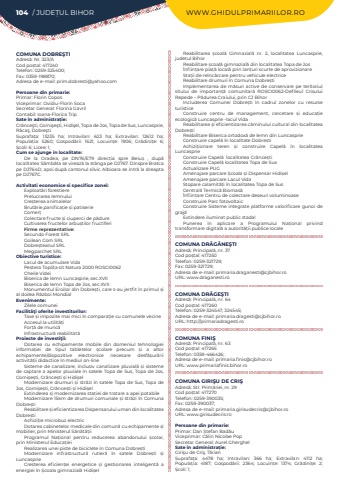 104 / JUDE%u021aUL BIHOR WWW.GHIDULPRIMARIILOR.ROCOMUNA DOBRE%u015eTIAdres%u0103: Nr. 323/ACod po%u0219tal: 417240Telefon: 0259-325400; Fax: 0359-198870; Adresa de e-mail: prim.dobresti@yahoo.comPersoane din primarie:Primar: Florin CoposViceprimar: Ovidiu-Florin SocaSecretar General: Florina GavrilContabil: Ioana-Florica TripSate %u00een administra%u021bie:Cr%u00e2nce%u015fti, Corni%u015fe%u015fti, Hidi%u015fel, Topa de Jos, Topa de Sus, Luncasprie, R%u00e2ca%u015f, Dobre%u015ftiSuprafa%u021ba:%u00a0 13235 ha; Intravilan:%u00a0 623 ha; Extravilan:%u00a0 12612 ha; Popula%u021bia:%u00a0 5260; Gospod%u0103rii:%u00a0 1621; Locuin%u021be:%u00a0 1906; Gr%u0103dini%u021be:%u00a0 6; %u0218coli:%u00a06; Licee:%u00a01; Cum se ajunge in localitate:De la Oradea, pe DN76/E79 direc%u021bia spre Beiu%u0219 , dup%u0103 localitatea S%u00e2mb%u0103ta se vireaz%u0103 la st%u00e2nga pe DJ767. Dinspre Bratca pe DJ764D, apoi dup%u0103 cantonul silvic Albioara se intr%u0103 la dreapta pe DJ767C.Activitati economice si specifice zonei:Exploat%u0103ri forestierePrelucrarea lemnuluiCre%u0219terea animalelorBrut%u0103rie,panifica%u021bie %u0219i patiserieComer%u021bColectare fructe %u0219i ciuperci de p%u0103dureCultivarea fructelor arbu%u0219tilor fructiferiFirme reprezentative:Secundo Forest SRLGoilean Com SRLDobre%u0219teanul SRL Megparchet SRLObiective turistice:Lacul de acumulare VidaPe%u0219tera Topli%u021ba sit Natura 2000 ROSCI0062Cheile VideiBiserica de lemn Luncasprie, sec.XVIIBiserica de lemn Topa de Jos, sec.XVII Monumentul Eroilor din Dobre%u0219ti, care s-au jertfit %u00een primul %u0219i al doilea R%u0103zboi MondialEvenimente:Zilele comuneiFacilit%u00e3%u0163i oferite investitorilor:Taxe %u0219i impozite mai mici %u00een compara%u021bie cu comunele vecineAccesul la utilit%u0103%u021biFor%u021b%u0103 de munc%u0103 Infrastructur%u0103 reabilitat%u0103Proiecte de investi%u0163ii:Dotarea cu echipamente mobile din domeniul tehnologiei informa%u021biei de tipul tabletelor %u0219colare precum %u0219i a altor echipamente/dispozitive electronice necesare desf%u0103%u0219ur%u0103rii activit%u0103%u021bii didactice %u00een mediul on-lineSisteme de canalizare, inclusiv canalizare pluvial%u0103 %u0219i sisteme de captare a apelor pluviale %u00een satele Topa de Sus, Topa de Jos, Corni%u0219e%u0219ti, Cr%u00e2nce%u0219ti %u0219i Hidi%u0219elModernizare drumuri %u0219i str%u0103zi %u00een satele Topa de Sus, Topa de Jos, Corni%u0219e%u0219ti, Cr%u00e2nce%u0219ti %u0219i Hidi%u0219elExtinderea %u0219i modernizarea sta%u021biei de tratare a apei potabileModernizare 15km de drumuri comunale %u0219i str%u0103zi %u00een Comuna Dobre%u0219tiReabilitare %u0219i eficientizarea Dispensarului uman din localitatea Dobre%u0219tiAchizi%u021bie microbuz electricDotarea cabinetelor medicale din comun%u0103 cu echipamente %u0219i mobilier, prin Ministerul S%u0103n%u0103t%u0103%u021biiProgramul Na%u021bional pentru reducerea abandonului %u0219colar, prin Ministerul Educa%u021bieiRealizarea unei piste de biciclete %u00een Comuna Dobre%u0219tiModernizare infrastructur%u0103 rutier%u0103 %u00een satele Dobre%u0219ti %u0219i LuncasprieCre%u0219terea eficien%u021bei energetice %u0219i gestionarea inteligent%u0103 a energiei %u00een %u0218coala gimnazial%u0103 Hidi%u0219elReabilitarea %u0219coal%u0103 Gimnazial%u0103 nr. 2, localitatea Luncasprie, jude%u021bul BihorReabilitare %u0219coal%u0103 gimnazial%u0103 din localitatea Topa de Jos%u00cenfiin%u021bare pia%u021b%u0103 local%u0103 prin lan%u021buri scurte de aprovizionareSta%u021bii de re%u00eenc%u0103rcare pentru vehicule electriceReabilitare drumuri %u00een Comuna Dobre%u0219tiImplementarea de m%u0103suri active de conservare pe teritoriul sitului de importan%u021b%u0103 comunitar%u0103 ROSCI0062-Defileul Cri%u0219ului Repede %u2013 P%u0103durea Craiului, prin CJ BihorIncluderea Comunei Dobre%u0219ti %u00een cadrul zonelor cu resurse turisticeConstruire centru de management, cercetare %u0219i educa%u021bie ecologic%u0103 Luncasprie -lacul VidaReabilitarea %u0219i eficientizarea c%u0103minului cultural din localitatea Dobre%u0219tiReabilitare Biserica ortodox%u0103 de lemn din LuncasprieConstruire capel%u0103 %u00een localitate Dobre%u0219tiAchizi%u021bionare teren %u0219i construire Capel%u0103 %u00een localitatea LuncasprieConstruire Capel%u0103 localitatea Cr%u00e2nce%u0219tiConstruire Capel%u0103 localitatea Topa de SusActualizare PUGAmenajare parcare %u0218coala %u0219i Dispensar Hidi%u0219elAmenajare parcare Lacul VidaStopare calamit%u0103%u021bi %u00een localitatea Topa de SusCentral%u0103 Termic%u0103 Biomas%u0103%u00cenfiin%u021bare Centru de colectare de%u0219euri voluminoaseConstruire Parc fotovoltaicConstruire Sisteme integrate platforme valorificare gunoi de grajdExtindere iluminat public stadal Punerea %u00een aplicare a Programului Na%u021bional privind transformare digital%u0103 a autorit%u0103%u021bii publice localeCOMUNA DR%u0102G%u0102NE%u015eTIAdres%u0103: Principal%u0103, nr. 37Cod po%u0219tal: 417250Telefon: 0259-321729; Fax: 0259-321729; Adresa de e-mail: primaria.draganesti@cjbihor.roURL: www.draganesti.roCOMUNA DR%u0102GE%u015eTIAdres%u0103: Principal%u0103, nr. 64Cod po%u0219tal: 417260Telefon: 0259-324547, 324545; Adresa de e-mail: primaria.dragesti@cjbihor.roURL: http://primariadragesti.roCOMUNA FINI%u015eAdres%u0103: Principal%u0103, nr. 63Cod po%u0219tal: 417265Telefon: 0359-466426; Adresa de e-mail: primaria.finis@cjbihor.roURL: www.primariafinis.bihor.roCOMUNA GIRI%u015eU DE CRI%u015eAdres%u0103: Str. Prim%u0103riei, nr. 29Cod po%u0219tal: 417270Telefon: 0259-390035; Fax: 0259-390037; Adresa de e-mail: primaria.girisudecris@cjbihor.roURL: www.girisudecris.roPersoane din primarie:Primar: Dan %u0218tefan Bad%u0103uViceprimar: C%u0103lin Nicolae PopSecretar General:%u00a0Aurel GherghelSate %u00een administra%u021bie:Giri%u015fu de Cri%u015f, T%u0103rianSuprafa%u021ba:%u00a0 4478 ha; Intravilan:%u00a0 366 ha; Extravilan:%u00a0 4112 ha; Popula%u021bia:%u0