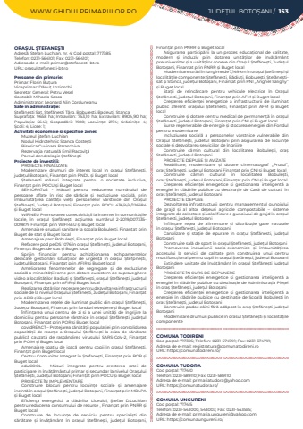 WWW.GHIDULPRIMARIILOR.RO JUDE%u021aUL BOTO%u0218ANI / 153ORA%u0218UL %u015eTEF%u0102NE%u015eTIAdres%u0103: Stefan Luchian, nr. 4; Cod po%u0219tal: 717385Telefon: 0231-564101; Fax: 0231-564101; Adresa de e-mail: primar@stefanesti-bt.roURL: orasulstefanesti-bt.roPersoane din primarie:Primar: Florin%u00a0Bu%u021buraViceprimar: D%u0103nu%u021b%u00a0LozinschiSecretar General: Petru%u00a0Vesel%u00a0Contabil:%u00a0Mihaela%u00a0Sasca%u00a0Administrator: Leonard Alin%u00a0Corduneanu%u00a0Sate %u00een administra%u021bie:%u015etef%u0103ne%u015fti Sat, %u015etef%u0103ne%u015fti T%u00e2rg, Bobule%u015fti, Badeuti, StancaSuprafa%u021ba:%u00a0 9658 ha; Intravilan:%u00a0 753,10 ha; Extravilan:%u00a0 8904,90 ha; Popula%u021bia:%u00a0 5643; Gospod%u0103rii:%u00a0 1928; Locuin%u021be:%u00a0 2174; Gr%u0103dini%u021be:%u00a0 4; %u0218coli:%u00a04; Licee:%u00a01; Activitati economice si specifice zonei:Muzeul %u015etefan LuchianNodul Hidrotehnic Stanca Coste%u015ftiBiserica Cuvioasa ParaschivaRezerva%u0163ia natural%u0103 Emil Racovi%u0163%u0103Parcul dendrologic %u015etef%u0103ne%u015ftiProiecte de investi%u0163ii:PROIECTE FINALIZATEModernizare drumuri de interes local %u00een ora%u0219ul %u0218tef%u0103ne%u0219ti, jude%u021bul Boto%u0219ani, Finan%u021bat prin PNDL %u0219i Buget local%u0218tefane%u0219ti m%u0103suri integrate pentru o societate incluziva, Finan%u021bat prin POCU %u0219i Buget localSENIORATuS - M%u0103suri pentru reducerea num%u0103rului de persoane aflate %u00een risc de s%u0103r%u0103cie %u0219i excluziune social%u0103, prin %u00eembun%u0103t%u0103%u021birea calit%u0103%u021bii vie%u021bii persoanelor v%u00e2rstnice din Ora%u0219ul %u0218tef%u0103ne%u0219ti, Jude%u021bul Boto%u0219ani, Finan%u021bat prin. POCU 436/4/4/126684 %u0219i Buget localWiFi4EU Promovarea conectivit%u0103%u021bii la internet %u00een comunit%u0103%u021bile locale, %u00een ora%u0219ul %u0218tef%u0103ne%u0219ti ac%u021biunea num%u0103rul 2-2019/007335-009879 Finan%u021bat prin WIFI4EU %u0219i Buget localAmenajare grupuri sanitare la %u0219coala Bobule%u0219ti, Finan%u021bat prin Buget de stat %u0219i Buget localAmenajare parc Bobule%u0219ti, Finan%u021bat prin Buget localRefacere pod pe DS 1076 %u00een ora%u0219ul %u0218tef%u0103ne%u021bti, jude%u021bul Boto%u0219ani, Finan%u021bat Buget de stat %u0219i Buget localSprijin financiar pentru achizi%u021bionarea echipamentelor dedicate gestion%u0103rii situa%u021biilor de urgen%u021b%u0103%u00a0 %u00een ora%u0219ul %u0218tefpne%u0219ti, jude%u021bul Boto%u0219ani, Finan%u021bat prin AFIR %u0219i Buget localAmeliorarea fenomenelor de segregare %u0219i de excluziune social%u0103%u00a0a minorit%u0103%u021bii rome prin dotare cu sistem de supraveghere video a localit%u0103%u021bilor Badiu%u021bi %u0219i %u0218tef%u0103ne%u0219ti, ora%u0219ul %u0218tef%u0103ne%u0219ti, jude%u021bul Boto%u0219ani, Finan%u021bat prin AFIR %u0219i Buget localRealizarea dot%u0103rilor necesare pentru dezvoltarea infrastructurii sociale de la nivelul Ora%u0219ului %u0218tef%u0103ne%u0219ti, Jude%u021bul Boto%u0219ani, Finan%u021bat prin AFIR %u0219i Buget localModernizarea re%u021belei de iluminat public din ora%u0219ul %u0218tef%u0103ne%u0219ti, Jude%u021bul Boto%u0219ani, Finan%u021bat prin fonduri elve%u021biene %u0219i Buget local%u00cenfiin%u021barea unui centru de zi si a unei unit%u0103%u021bi de %u00eengrijire la domiciliu pentru persoane v%u00e2rstnice %u00een ora%u0219ul %u0218tef%u0103ne%u0219ti, jude%u021bul Boto%u0219ani, Finan%u021bat prin POR %u0219i Buget localcovidREACT %u2013 Protejarea s%u0103n%u0103t%u0103%u021bii popula%u021biei prin consolidarea capacit%u0103%u021bii de reac%u021bie a Ora%u0219ului %u0218tef%u0103ne%u0219ti la criza de s%u0103n%u0103tate public%u0103%u00a0 cauzat%u0103%u00a0 de rasp%u00e2ndirea virusului SARS-CoV-2, Finan%u021bat prin POIM %u0219i Buget localAmenajare spa%u021biu de joac%u0103%u00a0pentru copii %u00een ora%u0219ul %u0218tef%u0103ne%u0219ti, Finan%u021bat prin Buget localCentru Comunitar Integrat %u00een %u0218tefane%u0219ti, Finan%u021bat prin POR %u0219i Buget localeduCOOL %u2013 M%u0103suri integrate pentru cre%u0219terea ratei de participare %u00een %u00eenv%u0103%u021b%u0103m%u00e2ntul primar %u0219i secundar la nivelul Ora%u0219ului %u0218tef%u0103ne%u0219ti, Jude%u021bul Boto%u0219ani, Finan%u021bat prin POCU %u0219i Buget localPROIECTE %u00ceN IMPLEMENTAREConstruire blocuri pentru locuin%u021be sociale %u0219i amenajare incint%u0103%u00a0%u00een ora%u0219ul %u0218tef%u0103ne%u0219ti, jude%u021bul Boto%u0219ani, Finan%u021bat prin MDLPA %u0219i Buget localEficien%u0163a energetic%u0103 a cl%u0103dirilor Liceului, %u015etefan D.Luchian pentru reducerea consumului de resurse , Finan%u021bat prin PNRR %u0219i Buget localConstruire de locuin%u021be de serviciu pentru speciali%u0219ti din s%u0103n%u0103tate %u0219i %u00eenv%u0103%u021b%u0103m%u00e2nt %u00een ora%u0219ul %u0218tef%u0103ne%u0219ti, jude%u021bul Boto%u0219ani, Finan%u021bat prin PNRR %u0219i Buget localAsigurarea particip%u0103rii la un proces educa%u021bional de calitate, modern %u0219i incluziv prin dotarea unit%u0103%u021bilor de %u00eenv%u0103%u021b%u0103m%u00e2nt preuniversitar %u0219i a unit%u0103%u021bilor conexe din Ora%u0219ul %u0218tef%u0103ne%u0219ti, Jude%u021bul Boto%u0219ani, Finan%u021bat prin PNRR %u0219i Buget localModernizare str%u0103zi %u00een lungime de 7,149 km %u00een ora%u0219ul %u0218tef%u0103ne%u0219ti %u0219i localit%u0103%u021bile componente: %u0218tef%u0103ne%u0219ti, B%u0103diu%u021bi, Bobule%u0219ti, %u0218tef%u0103ne%u0219tisat %u0219i Stanca, jude%u021bul Boto%u0219ani, Finan%u021bat prin PNI %u201eAnghel Saligny%u201d %u0219i Buget localSta%u021bii de re%u00eenc%u0103rcare pentru vehicule electrice %u00een Ora%u0219ul %u0218tef%u0103ne%u0219ti, jude%u021bul Boto%u0219ani, Finan%u021bat prin AFM %u0219i Buget localCre%u0219terea eficien%u021bei energetice a infrastructurii de iluminat public aferent ora%u0219ului %u0218tef%u0103ne%u0219ti, Finan%u