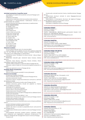 32 / JUDE%u021aUL ALBA WWW.GHIDULPRIMARIILOR.ROActivitati economice si specifice zonei:Activit%u0103%u0163ile principale ale locuitorilor comunei Po%u015faga sunt :AgriculturaCre%u015fterea animalelorExploatarea materialului lemnos %u015fi prelucrarea acestuia Prelucrarea %u0219i comercializarea materialului lemnos %u0219i a prefabricatelor din aceastaComercializarea de produse alimentare %u0219i nealimentareFirme reprezentative:SC Bulgar TransSC Moldy&Moata SRLSCBulea SRLPFA Cirebea EmilCreativ instal consult SRLForest Star Posaga SRLLavi&Cosm Forest%u00a0 SRLSC Darius &Ela SRLSC Rox&Avi SRLSC Vio&Gaby Trans%u00a0 SRLScarita Belioara SRLI.I. Craiu TodorSC Alcsan For SRLPFA Cirebea Emil PFA Geflea GligorObiective turistice:Printre obiectivele pe care vi le recomand%u0103m:Cheile Po%u015f%u0103gii care se g%u0103sesc la 6 km de la %u015foseaua na%u0163ional%u0103 DN 75, chei%u00a0 formate %u00eentre dou%u0103 masive muntoase Feredeu %u015fi Vulturese %u015fi care ad%u0103poste%u015fte un peisaj feericM%u0103n%u0103stirea Izvoru T%u0103m%u0103duirii %u0219i izvorul termal - Izbucul Bujor din apropiereRezerva%u021bia natural%u0103 geo- botanic%u0103 %u0218esul Craiului,%u00a0 Sc%u0103ri%u021ba BelioaraPe%u0219terile: Co%u0219ul Boului, Vulturese, Poarta Zmeilor, Piatra C%u00e2nt%u0103toare %u201cAvenul din Vulturese%u201dVechile colibe acoperite cu paie din St%u00e2na, Po%u0219aga de JosV%u00e2ltoarea unde %u0219i ast%u0103zi se mai practic%u0103 sp%u0103latul pre%u0219urilor %u0219i %u021boalelor Moara pe ap%u0103 satul Lunca %u0219i Po%u0219aga de JosFacilit%u00e3%u0163i oferite investitorilor:Oportunit%u0103%u021biTerenuri la pre%u021b%u00a0foarte accesibil %u00een zona pitoreasc%u0103Proiecte de investi%u0163ii:Proiecte de investi%u0163ii finalizate :Dare %u00een folosin%u021b%u0103 centru multifunc%u021bional Po%u0219aga de SusAchizi%u021bie autoturism DusterDemersuri pentru acoperirea teritoriului comunei cu semnal de telefonie mobil%u0103Reabilitare monumentul eroilor satul Po%u0219aga de JosDotarea serviciului pentru situa%u021bii de urgen%u021b%u0103 cu ma%u0219ina pentru stingerea incendiilorAmenajamentul pastoralAlimentare cu ap%u0103 satul SagageaDotare c%u0103min cultural Po%u0219aga de JosModernizare drum forestier Ince%u0219tiModernizare drumuri vicinale %u00cen Posaga de Jos%u00a0 asfaltare 5,6 kmConstruire remiz%u0103%u00a0PSIModernizare DC 43 Valea Beliorii -1 kmModernizare infrastructur%u0103%u00a0rutier%u0103%u00a0%u00een Comuna Po%u0219aga%u00a0 6,6 kmProiecte de investi%u0163ii %u00een derulareFinalizare PUG comuna Po%u0219agaModernizare drumuri interioare satul Lunca Arie%u0219ului,asfaltare 5.8 kmLucr%u0103ri interioare %u0219i dotare anex%u0103 prim%u0103rieModernizare DC 43 Valea Beliorii- 1,2 kmAp%u0103r%u0103ri de maluri %u0219i accese la propriet%u0103%u021bi drum comunal DC 43, Po%u0219aga de SusModernizare infrastructur%u0103%u00a0rutier%u0103%u00a0%u00een comuna Po%u0219aga tronson II-9,4 km%u00cembunat%u0103%u021birea serviciilor publice pentru cre%u0219terea calit%u0103%u021bii vie%u021bii cet%u0103%u021benilor prin digitalizare, realizarea infrastructurii TIC -sisteme inteligente de management local %u00een Comuna Po%u0219aga Proiecte noi:Construc%u021bie central%u0103%u00a0 termic%u0103%u00a0 Centru Multifunc%u021bional Po%u0219aga de SusModernizare drumuri vicinale %u00een satul S%u0103gagea,Comuna Po%u0219aga, Jude%u021bul AlbaDeschiderea %u0219i amenajarea drumului de leg%u0103tur%u0103 Po%u0219agaOcoli%u0219%u2013B%u0103i%u0219oara %u00een baza unui proiect comunReabilitare cl%u0103dire prim%u0103rieExtindere %u0219i reabilitare iluminat Po%u0219agaCOMUNA R%u00c2ME%u0162Adres%u0103: Principal%u0103, nr. 1Cod po%u0219tal: 517590Telefon: 0258-880026, 880015-%u015ecoala gimnazial%u0103 Clasele I-VIII R%u00e2me%u0163; Fax: 0258-880026, 880015; Adresa de e-mail: primariaramet2008@yahoo.comURL: comunarimet.roCOMUNA RIMETEAAdres%u0103: Principal%u0103, nr. 34Cod po%u0219tal: 517610; Telefon: 0258-768001; Adresa de e-mail: contact@primariarimetea.roURL: http://www.primariarimetea.roCOMUNA RO%u015eIA DE SECA%u015eAdres%u0103: Principal%u0103, nr. 458Cod po%u0219tal: 517640Telefon: 0258-765777; Fax: 0372-008603; Adresa de e-mail: primariarosia@yahoo.comURL: www.rosiadesecas.roCOMUNA RO%u015eIA MONTAN%u0102Adres%u0103: Principal%u0103, nr. 184Cod po%u0219tal: 517615; Telefon: 0258-783101; Adresa de e-mail: primaria@primariarosiamontana.roURL: www.primariarosiamontana.roCOMUNA S%u0102LCIUAAdres%u0103: Sat Salciua de Jos , Principal%u0103, nr. 62Cod po%u0219tal: 517648Telefon: 0258-788740; Fax: 0258-788600; Adresa de e-mail: primariasalciua@yahoo.comURL: https://comunasalciua.ro/COMUNA S%u0102LI%u015eTEAAdres%u0103: Str. Preot Constantin Oancea nr.2Cod po%u0219tal: 517655; Telefon: 0258-762101; Adresa de e-mail: primaria_salistea@yahoo.comURL: www.comuna-salistea.roCOMUNA S%u0102SCIORIAdres%u0103: Principal%u0103, nr. 363Cod po%u0219tal: 517660Telefon: 0258-741110, 741755; Adresa de e-mail: primariasasciori@yahoo.comURL: http://www.comunasasciori.roCOMUNA S%u00c2NCELAdres%u0103: Mihai Eminescu, nr. 70Cod po%u0219tal: 517670Telefon: 0258-885101; Fax: 0258-885088; Adresa de e-mail: primariasincel@yahoo.comprimarie_sincel@ab.e-adm.roURL: http://www.primariasincel.ro