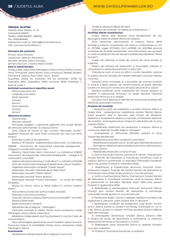 38 / JUDE%u021aUL ALBA WWW.GHIDULPRIMARIILOR.ROORA%u0218UL ZLATNAAdres%u0103: Calea Mo%u0163ilor, nr. 12Cod po%u0219tal: 516100Telefon: 0258-856337 , 856735; Fax: 0258-856583; Adresa de e-mail: pr_zlatna@primariazlatna.roURL: www.primaria-zlatna.roPersoane din primarie:Primar: Silviu PonoranViceprimar: Valentin Romo%u0219ianSecretar General: Adina Zavragiu%u015eef Serv.Fin.Cont.: Cristina Maria CristeaSate %u00een administra%u021bie:Fene%u015f, Gala%u0163i, Valea Mic%u0103, P%u0103tr%u00e2ngeni, Podu lui Paul, P%u00e2r%u00e2u Gruiului, Pirita, Tr%u00eempoiele, Dealu Roatei, Izvoru Ampoiului, Bote%u015fti, Budeni, Dumbrav%u0103, Dobrot, Ru%u015fi, V%u00eeltori, Runc, SuseniSuprafa%u021ba:%u00a0 24065 ha; Intravilan:%u00a0 915 ha; Extravilan:%u00a0 23150 ha; Popula%u021bia:%u00a0 8612; Gospod%u0103rii:%u00a0 2969; Locuin%u021be:%u00a0 3508; Gr%u0103dini%u021be:%u00a0 7; %u0218coli:%u00a08; Licee:%u00a01; Activitati economice si specifice zonei:Prelucrarea lemnuluiCre%u015fterea animalelorMic%u0103 industrieComer%u0163ServiciiMica industrieComer%u0163ServiciiObiective turistice:Oportunit%u0103%u0163i:Resurse naturalePrincipala bog%u0103%u0163ie o reprezint%u0103 p%u0103durile care ocup%u0103 58,25% din teritoriul administrativ al ora%u015fului ZlatnaZona Zlatna se %u00eenscrie %u00een a%u015fa numitul %u201cPatrulater aurifer%u201d, bog%u0103%u0163iile minerale din zon%u0103 fiind cunoscute din cele mai vechi timpuriPoten%u0163ial turistic %u015fi de agrement:Biserica %u201cSf. Nicolae - Na%u015fterea Maicii Domnului%u201d cu indicativul 01B298 - monument de importan%u0163%u0103 na%u0163ional%u0103 excep%u0163ional%u0103 - categoria A construit%u0103 %u00een anul 1424Biserica %u201cAdormirea Maicii Domnului%u201d cu indicativul 01B297 monument de importan%u0163%u0103 na%u0163ional%u0103 excep%u0163ional%u0103 - categoria B construit%u0103 %u00een anul 1630A%u015fezare din epoca bronzului %u201cLa Bulbuci%u201d cu indicativul 01A036Zone de importan%u0163%u0103 arheologic%u0103 apar%u0163in%u00e2nd culturii Co%u0163ofeniVegeta%u0163ia rezerva%u0163iei complexe %u201cCheile Caprei%u201dRezerva%u0163ia natural%u0103 %u201cCalcarele de la Valea Mic%u0103%u201dRezerva%u0163ia natural%u0103 %u201cCheile Caprei%u201dRezerva%u0163ia natural%u0103 %u201cPiatra Bulbuci%u201dRezerva%u0163ia natural%u0103 %u201cPoiana Narciselor%u201d - cu acces din Valea Fene%u015feluiBustul lui Avram Iancu %u015fi Petre Dobra %u00een centrul ora%u015fului ZlatnaMonumentul eroilor din primul r%u0103zboi mondialPoten%u0163ial cultural %u015fi ecumenic:Casa de Cultur%u0103 a ora%u015fului Zlatna (Conacul Kendeffi - Horvath)Biserica Reformat%u0103Biserica Romano-Catolic%u0103M%u0103n%u0103stirea de la Negraia - P%u0103tr%u00e2ngeniC%u0103minele culturale %u00een satele: Fene%u015f, Izvoru Ampoiului, Gala%u0163i P%u0103tr%u00e2ngeni, Pirita, V%u00e2ltori, Valea Mic%u0103Biblioteca Or%u0103%u015feneasc%u0103 care func%u0163ioneaz%u0103 %u00een incinta Casei de Cultur%u0103 ZlatnaSituri arheologice apar%u0163in%u00e2nd culturii Co%u0163ofeni, epocii romane, bronzului timpuri %u00een localit%u0103%u0163iile: Fene%u015f, Izvoru Ampoiului, Gala%u0163i P%u0103tr%u00e2ngeni, ZlatnaEvenimente:S%u0103rb%u0103toarea C%u00e2mpeneasc%u0103 de la Negraia %u00een luna maiTradi%u0163ii %u015fi obiceiuri legate de oieritFestivalul de roman%u0163e %u201cTe a%u015ftept pe acela%u015fi drum...%u201dFacilit%u00e3%u0163i oferite investitorilor:Ora%u015ful Zlatna este declarat zon%u0103 devaforizat%u0103, de aici decurg%u00e2nd toate facilit%u0103%u0163ile oferite de aceasta:Zona teritoriului administrativ al ora%u015fului Zlatna ofer%u0103 facilit%u0103%u0163i %u015fi %u00eenlesniri investitorilor din zon%u0103 %u00een conformitate cu OG nr. 27/1996, Legea 571/2003, OUG 24/1998, HG 323/1996 (privind acordarea de facilit%u0103%u0163i persoanelor care domiciliaz%u0103 sau lucreaz%u0103 %u00een unele localit%u0103%u0163i din Mun%u0163ii Apuseni %u015fi Rezerva%u0163ia Biosferei %u201cDelta Dun%u0103rii%u201d)Gradul de calificare al for%u0163ei de munc%u0103 din zon%u0103 (mediu %u015fi superior)Pre%u0163uri de v%u00e2nzare ale terenurilor %u015fi locuin%u0163elor sc%u0103zute %u00een compara%u0163ie cu pre%u0163urile practicate %u00een restul %u0163%u0103rii%u0162in%u00e2ndu-se cont c%u0103 zona se afl%u0103 %u00een mun%u0163ii Metaliferi, con%u0163ine %u00een subsol resurse naturale de metale neferoase, se poate relansa mineritulDatorit%u0103 zonei muntoase %u015fi a punctelor de atrac%u0163ie turistic%u0103 %u00een zon%u0103 %u015fi a lipsei spa%u0163iilor de cazare turistic%u0103, se poate dezvolta turismul %u00een zon%u0103 prin construirea de spa%u0163ii de primire %u015fi cazareDatorit%u0103 existen%u0163ei zonei %u00eemp%u0103durite din Mun%u0163ii Apuseni %u015fi tradi%u0163iei %u00een prelucrarea lemnului, se poate dezvolta industria prelucr%u0103rii lemnului %u015fi a mobileiLocuitorii sunt deschi%u015fi la ofertele de reconversie profesional%u0103 oferite de poten%u0163ialii investitoriProiecte de investi%u0163ii:1. Programul pilot de reabilitare a zonelor fierbin%u0163i Zlatna %u015fi Cop%u015fa Mic%u0103 - subprogramul reabilitarea zonelor fiebin%u0163i Zlatna. Acest program este %u00een derulare, este fina%u0163at de Ministerul Mediului %u015fi Gospod%u0103ririi Apelor %u015fi cuprinde urm%u0103toarele obiective de investi%u0163ii:- Amenajarea r%u00e2ului Ampoi %u015fi a afluen%u0163ilor s%u0103i, %u00een zona ora%u015fului Zlatna- Reabilitarea sistemului de salubrizare a ora%u015fului Zlatna %u015fi construire sta%u0163ie de transfer de%u015feuri menajere- Ecologizarea %u015fi %u00eenl%u0103turarea efectelor polu%u0103rii %u00een zona industrial%u0103 dezafectat%u0103- Reabilitare %u015fi extindere canalizare ora%u015f Zlatna- Reabilitarea ecosistemului %u00een zonele grav afectate de poluare- Extinderea re%u0163elei de ap%u0103 potabil%u0103 pe teritoriul administrativ al ora%u015fului Zlatna- Reabilitarea fostei albii a r%u00e2ul