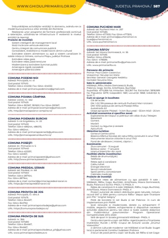 WWW.GHIDULPRIMARIILOR.RO JUDE%u021aUL PRAHOVA / 587%u00cembun%u0103t%u0103%u0163irea activit%u0103%u0163ilor entit%u0103%u0163ii %u00een domeniu, av%u00e2ndu-se ca model buna practica a altor entit%u0103%u0163i din Rom%u00e2niaRealizarea unor programe de formare profesional%u0103 continu%u0103 a salaria%u0163ilor, utiliz%u00e2ndu-se infrastructura IT existent%u0103 la nivelul entit%u0103%u0163ii (e-learnig)Proiecte de investi%u0163ii:Sistem inteligent de management localSta%u021bii %u00eenc%u0103rcare vehicule electriceCentru integrat de comunicare public%u0103Consolidare, reabilitare %u0219i modernizare c%u0103min culturalExtindere sistem alimentare cu ap%u0103%u00a0 %u0219i sistem canalizare %u00een satele H%u00e2r%u0219a %u0219i Gilmeia, comuna Plopu, jude%u021bul%u00a0PrahovaExtindere re%u021bea gazeExtindere re%u021bea joas%u0103%u00a0tensiuneModernizare %u0219i extindere iluminat publicAmenajare rigol%u0103%u00a0carosabil%u0103Amenajare piste bicicleteCOMUNA PODENII NOIAdres%u0103: Principal%u0103, nr. 41Cod po%u0219tal: 107410Telefon: 0244-414032; Fax: 0244-414032; Adresa de e-mail: primaria.podeniinoi@gmail.comCOMUNA POIANA C%u00c2MPINAAdres%u0103: Uzinei, nr. 462Cod po%u0219tal: 107425Telefon: 0244-351367, 351920; Fax: 0244-351367; Adresa de e-mail: primpoianacampina@yahoo.comURL: http://primariapoiana-campina.ro/COMUNA POIENARII BURCHIIAdres%u0103: G-ral Angelescu, nr. 22Cod po%u0219tal: 107430Telefon: 0244-486244, 486015; Fax: 0244-486244 ; Adresa de e-mail: primariapoienarib@yahoo.comURL: http://primariapoienariiburchii.ro/COMUNA POSE%u015eTIAdres%u0103: str. Primariei nr 5Cod po%u0219tal: 107440Telefon: 0244-422201; Fax: 0244-422201; Adresa de e-mail: primariaposesti@yahoo.comURL: http://www.primariaposesti.roCOMUNA PREDEAL S%u0102RARIAdres%u0103: sat Predeal, nr. 68Cod po%u0219tal: 107460Telefon: 0244-287164; Fax: 0244-287164; Adresa de e-mail: contact@primariapredeal-sarari.roURL: https://primariapredeal-sarari.ro/COMUNA PROVI%u0162A DE JOSAdres%u0103: Principal%u0103, nr. 494 ACod po%u0219tal: 107475Telefon: 0244-354227; Fax: 0244-354792; Adresa de e-mail: primariaprovitadejos@yahoo.comURL: https://comunaprovitadejos.ro/COMUNA PROVI%u0162A DE SUSAdres%u0103: nr. 366Cod po%u0219tal: 107480Telefon: 0244-354567; Fax: 0244-354567; Adresa de e-mail: primariaprovitadesus_ph@yahoo.comURL: www.primariaprovitadesus.roCOMUNA PUCHENII MARIAdres%u0103: sat Puchenii Mari nr. 257Cod po%u0219tal: 107485Telefon: 0244-477305; Fax: 0244-477305; Adresa de e-mail: primaria@pucheniimari.rotaxe@pucheniimari.roURL: www.pucheniimari.roCOMUNA R%u00c2FOVAdres%u0103: Sat Moara Domneasc%u0103, nr. 55Cod po%u0219tal: 107495Telefon: 0244-478416; Fax: 0244- 478589; Adresa de e-mail: primariarifov@yahoo.comURL: www.primariarifov.roPersoane din primarie:Primar: Paul Costin CazanciucViceprimar: Niculae Ion StateSecretar General:%u00a0Georgeta NedelcuContabil: Niculina MicuSate %u00een administra%u021bie:M%u0103l%u0103ie%u015fti,%u00a0R%u00eefov, Moara Domneasc%u0103,%u00a0Buda, Palanca,%u00a0Goga,%u00a0Sicrita,%u00a0Antofiloaia, Buchila%u015fiSuprafa%u021ba:%u00a04174,956 ha; Intravilan:%u00a0353,367 ha; Extravilan:%u00a03818,589 ha; Popula%u021bia:%u00a05379; Gospod%u0103rii:%u00a01681; Locuin%u021be:%u00a01868; Gr%u0103dini%u021be:%u00a06; %u0218coli:%u00a07; Cum se ajunge in localitate:C%u0103i de acces:DN 1-DJ 139 %u015foseaua de centur%u0103 Puchenii Mari-UrziceniDN1 101D %u015foseaua de centur%u0103 Ploie%u015fti-R%u00eefovAutostrada A3 Ora%u015fe apropiate: Ploie%u015fti - 14 km Bucure%u015fti - 55 km Mizil - 25 kmActivitati economice si specifice zonei:Exploatarea de nisipuri %u0219i pietri%u0219uri din albia r%u00e2ului TeleajenBalastier%u0103Comer%u021bMor%u0103ritComer%u021b%u00a0cu legume %u0219i cerealeApicultur%u0103Obiective turistice:Conacul CantacuzinoBiserica Sf%u00e2ntul%u00a0Nicolae din satul R%u00eefov constuit%u0103 %u00een anul 1748Monumente istorice ctitorite %u00een anul 1743Fond de v%u00e2n%u0103toare ( mistre%u021b, c%u0103prior )Evenimente:Ziua comunei - 15 augustBotezul cailor - 7 ianuarieHramul bisericilor din zon%u0103Facilit%u00e3%u0163i oferite investitorilor:Re%u021bea de drumuri(dj,dc)TelefonieRe%u021bea ap%u0103 %u0219i canalizareCablu tv/netEnergie electric%u0103Servicii salubrizareSpa%u021bii pentru concesionareCabinete medicaleProiecte de investi%u0163ii:%u00cenfiin%u021bare re%u021bea de alimentare cu apa potabil%u0103- 9 sate : M%u0103l%u0103ie%u0219ti, R%u00e2fov, Goga, Buchila%u021bi, Antofiloaia, Moara Domneasc%u0103, Buda, Palanca si Sicrita -PNDL I si PNDL IIRe%u021bea de canalizare %u00een 6 sate: M%u0103l%u0103ie%u0219ti, R%u00e2fov, Goga, Buchila%u0219i, Antofiloaia, Moara Domneasc%u0103- PNDL IIProiect autorizat de sistem distribu%u021bie gaze naturale, inclusiv racord SNT %u0219i SRM pentru comuna R%u00e2fov- depus spre finan%u021bare prin PNI %u201c Anghel Saligny%u201dPist%u0103 de biciclete %u00een sat Buda %u0219i sat Palanca- %u00een curs de implementare prin PNRR%u0218coli renovate %u0219i modernizate, dotate cu echipament IT mobile, respectiv tablete, echipamente %u0219i dispozitive necesare activit%u0103%u021bii didactice pentru to%u021bi elevii %u0219i toate cadrele didactice din %u00eenv%u0103t%u00e2m%u00e2ntul preuniversitar- Program Operational Competitivitate 2014-2020Sal%u0103 de sport %u00een %u0218coala gimnazial%u0103 M%u0103l%u0103ie%u0219ti- PNDL IICentru de zi pentru copii- sat R%u00e2fov- Agen%u021bia pentru Finan%u021barea Investi%u021biilor Rurale ( AFIR)- Grupul de Ac%u021biune Locala %u201eDrumul Voievozilor%u201d2 c%u0103mine culturale moderne- sat M%u0103l%u0103ie%u0219ti %u0219i sat Buda- buget local si parteneriat Consiliul Jude%u021bean Prahova3 locuri de joac%u0103 pentru copii- sat Buda, sat R%u00e2fov %u0219i sat Goga-