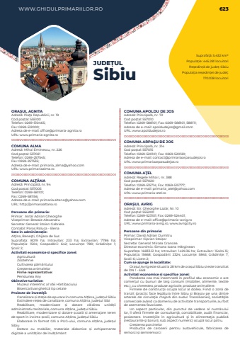 WWW.GHIDULPRIMARIILOR.RO 623Suprafa%u021b%u0103: 5.432 km%u00b2Popula%u021bie: 445.281 locuitoriRe%u0219edin%u021b%u0103 de jude%u021b: SibiuPopula%u021bia re%u0219edin%u021bei de jude%u021b: 170.038 locuitoriJUDE%u021aULSibiuORA%u0218UL AGNITAAdres%u0103: Pia%u0163a Republicii, nr. 19Cod po%u0219tal: 555100Telefon: 0269-510465; Fax: 0269-512000; Adresa de e-mail: office@primaria-agnita.roURL: www.primaria-agnita.roCOMUNA ALMAAdres%u0103: Mihai Eminescu, nr. 226Cod po%u0219tal: 557021Telefon: 0269-257545; Fax: 0269-257535; Adresa de e-mail: primaria_alma@yahoo.comURL: www.primariaalma.roCOMUNA AL%u0162%u00c2NAAdres%u0103: Principal%u0103, nr. 94Cod po%u0219tal: 557005Telefon: 0269-581101; Fax: 0269-581156; Adresa de e-mail: primaria.altana@yahoo.comURL: http://primariaaltana.roPersoane din primarie:Primar:%u00a0 Antal Adrian GheorgheViceprimar: Brezaie AlexandruSecretar General: Stoian GabrielaContabil: Paro%u0219 Raluca - ElenaSate %u00een administra%u021bie:Al%u0163%u00eena, Bene%u015fti, Ghijasa de SusSuprafa%u021ba:%u00a0 8019 ha; Intravilan:%u00a0 233 ha; Extravilan:%u00a0 7786 ha; Popula%u021bia:%u00a0 1504; Gospod%u0103rii:%u00a0 642; Locuin%u021be:%u00a0 780; Gr%u0103dini%u021be:%u00a0 1; %u0218coli:%u00a02; Activitati economice si specifice zonei:Agricultur%u0103ZootehnieCultivarea p%u0103m%u00e2ntuluiCre%u015fterea animalelorFirme reprezentative:Pensiunea AnyObiective turistice:Muzeul interetnic al V%u0103ii H%u00e2rtibaciuluiBiserica Evanghelic%u0103 tip cetate%u00a0Proiecte de investi%u0163ii:Canalizare %u0219i sta%u021bie de epurare %u00een comuna%u00a0Al%u021b%u00e2na, jude%u021bul%u00a0SibiuExtindere re%u021bea de canalizare, comuna%u00a0Al%u021b%u00e2na, jude%u021bul%u00a0SibiReabilitare, modernizare %u0219i dotare cl%u0103direa unit%u0103%u021bii administrativ teritoriale, comuna Al%u021b%u00e2na, jude%u021bul SibiuReabilitare, modernizare %u0219i dotare %u0219coal%u0103%u00a0%u0219i amenajare teren de sport %u00een incinta %u0219colii, comuna Al%u021b%u00e2na, jude%u021bul SibiuElaborare %u00een format GIS a PUG-ului, comuna Al%u021b%u00e2na, jude%u021bul SibiuDotare cu mobilier, materiale didactice %u0219i echipamente digitale a unit%u0103%u021bilor de %u00eenv%u0103%u021b%u0103m%u00e2ntCOMUNA APOLDU DE JOSAdres%u0103: Principal%u0103, nr. 72Cod po%u0219tal: 557010Telefon: 0269-588101; Fax: 0269-588101, 588111; Adresa de e-mail: apoldudejos@gmail.comURL: www.apoldudejos.roCOMUNA ARPA%u015eU DE JOSAdres%u0103: Principal%u0103, nr. 214Cod po%u0219tal: 557015Telefon: 0269-520101; Fax: 0269-520120; Adresa de e-mail: contact@primariaarpasudejos.roURL: www.primariaarpasudejos.roCOMUNA A%u0162ELAdres%u0103: Regele Mihai I, nr. 388Cod po%u0219tal: 557020Telefon: 0269-515714; Fax: 0269-515777; Adresa de e-mail: primaria_atel@yahoo.comURL: www.primaria-atel.roORA%u0218UL AVRIGAdres%u0103: Str. Gheorghe Laz%u0103r, Nr. 10Cod po%u0219tal: 555200Telefon: 0269-523101; Fax: 0269-524401; Adresa de e-mail: office@primaria-avrig.roURL: www.primaria-avrig.ro, www.avrigcity.roPersoane din primarie:Primar:%u00a0David Adrian DumitruViceprimar: Ciprian Stoi%u0219orSecretar%u00a0General:%u00a0Mircea GranceaDirector econimic: Simona Ioana M%u0103rgineanSuprafa%u021ba:%u00a016833.51 ha; Intravilan:%u00a01429.36 ha; Extravilan:%u00a015404.15; Popula%u021bia:%u00a0 15668; Gospod%u0103rii:%u00a0 2324; Locuin%u021be:%u00a0 5845; Gr%u0103dini%u021be:%u00a0 7; %u0218coli:%u00a06; Licee:%u00a02; Cum se ajunge in localitate:Ora%u0219ul Avrig este situat la 28 km de ora%u0219ul Sibiu %u0219i este tranzitat de DN 1 - E68Activitati economice si specifice zonei:Ponderea cea mai %u00eensemnat%u0103 %u00een profilul s%u0103u economic o are comer%u0163ul cu bunuri de larg consum (mobilier, alimente, textile etc.), cu cherestea, produse agricole, produse animaliere.Firmele de construc%u0163ii ocup%u0103 locul al doilea. Fiind o zon%u0103 de tranzit (practic face leg%u0103tura %u00eentre Sibiu %u015fi Bra%u015fov pe una dintre arterele de circula%u0163ie major%u0103 din sudul Transilvaniei), societ%u0103%u0163ile comerciale av%u00e2nd ca domeniu de activitate transporturile, au fost de asemenea favorizate.Un aspect particular, din punctul de vedere al num%u0103rului lor, %u00eel ofer%u0103 firmele de consultan%u0163%u0103, contabilitate, audit financiar, proiectare. Investi%u0163iile %u00een agricultur%u0103 %u015fi %u00een alimenta%u0163ia public%u0103 (restaurante %u015fi baruri), sub aspect numeric) ocup%u0103 locul patru.Cre%u0219terea porcinelorProduc%u021bia de caroserii pentru autovehicule, fabricarea de remorci %u0219i semiremorci