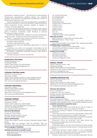 WWW.GHIDULPRIMARIILOR.RO JUDE%u021aUL SUCEAVA / 649Dumbr%u0103veni, Jude%u021bul Suceava%u201d - Axa prioritar%u0103 10 %u00cembun%u0103t%u0103%u021birea infrastructurii educa%u021bionale, Obiectiv specific 10.2 Cre%u0219terea gradului de participare la %u00eenv%u0103%u0163%u0103m%u00e2ntul profesional %u015fi tehnic %u015fi %u00eenv%u0103%u0163are pe tot parcursul vie%u0163ii%u00a0 %u201d.Construire platform%u0103 comunal%u0103 de depozitare %u0219i gospod%u0103rire a gunoiului de grajd %u00een comuna Dumbr%u0103veni, jude%u021bul Suceava%u00a0%u00een cadrul proiectului privind controlul integrat al polu%u0103rii cu nutrien%u021bi- finan%u021bare adi%u021bional%u0103Achizi%u021bie autospecial%u0103 de stingere a incendiilor pentru dotare SVSU din comuna Dumbr%u0103veni, jude%u021bul Suceava %u00eentre agen%u021bia pentru finan%u021barea investi%u021biilor rurale- Rom%u00e2nia %u0219i comuna Dumbr%u0103veni, jude%u021bul SuceavaConstruire %u0219i dotare centru medical %u00een comuna Dumbr%u0103veni, jude%u021bul Suceava%u00a0- Programul na%u021bional de dezvoltare local%u0103 2.Proiect - %u201eConstruire centru cultural- proiect tip- varianat V1%u00a0 %u2013 %u00een comuna Dumbr%u0103veni, jude%u021bul Suceava %u201d.Extindere re%u021bele canalizareExtindere re%u021bea alimentare cu ap%u0103Implementare solu%u021bii de digitalizare eguvernare in comuna Dumbr%u0103veniConstruirea unui centru de recuperare neuromotorie de tip ambulatoriu pentru persoanele cu dizabilit%u0103%u021bi in comuna Dumbr%u0103veni%u00a0Extinderea si reabilitarea sistemelor de ap%u0103 si ap%u0103 uzat%u0103 in comuna Dumbr%u0103veniAchizi%u021bie utilaj greu comuna Dumbr%u0103veniMUNICIPIUL F%u0102LTICENIAdres%u0103: Republicii nr. 13Cod po%u0219tal: 725200Telefon: 0230-541422; Fax: 0230-544942; Adresa de e-mail: falticeni@falticeni.roURL: www.falticeni.roCOMUNA F%u00c2NT%u00c2NA MAREAdres%u0103: Gr. M. CantacuzinoCod po%u0219tal: 727566Telefon: 0230-543280, 543270; Fax: 0230-543280, 543270; Adresa de e-mail: primaria_fantana_mare@yahoo.comURL: www.comunafantanamare.roCOMUNA F%u00c2NT%u00c2NELECod po%u0219tal: 727230Telefon: 0230-537749, 537956; Fax: 0230-537749 int. 21; Adresa de e-mail: primaria.fintinele@yahoo.comURL: www.primariafintinele.roCOMUNA FOR%u0102%u015eTIAdres%u0103: Str. Principala, nr. 1Cod po%u0219tal: 727235Telefon: 0230-542924; Fax: 0230-542924; Adresa de e-mail: forasti@prefecturasuceava.roprimaria_forasti@yahoo.comURL: http://www.primariaforasti.ro/Persoane din primarie:Primar: Avr%u0103mia%u00a0Br%u0103du%u0163%u00a0Viceprimar:%u00a0 Petru%u00a0Petrov%u00a0Secretar General: Ani%u015foara%u00a0%u00a0Enachi%u00a0Contabil: Aurelia Daniela%u00a0NistorSate %u00een administra%u021bie:For%u0103%u015fti, Ru%u015fi, Ro%u015fiori, Oniceni, Antoceni, Manolea, Uide%u015fti, Tole%u015fti, BouraSuprafa%u021ba:%u00a0 6400 ha; Intravilan:%u00a0 4200 ha; Extravilan:%u00a0 2200 ha; Popula%u021bia:%u00a04400; Gospod%u0103rii:%u00a02260; Locuin%u021be:%u00a02083; Gr%u0103dini%u021be:%u00a06; %u0218coli:%u00a07; Cum se ajunge in localitate:DN 2-E 85 Bucure%u0219ti-Suceava km 390Activitati economice si specifice zonei:Agricultura: piscicultura, apicultura, legumiculturaPreparate lactateFirme reprezentative:SC. CAVIOR AGRO SRLSC FORAGRO SRLSC IULIANA SRLSC ALEXA SRLProduc%u0103tori locali:Grigora%u0219%u00a0Nica, Grigora%u0219%u00a0DorinLivadaru DucuCurelariu CristiHargau TraianBuzila DumitruTacu IonProduse locale:Preparate lactate, miere, preparateObiective turistice:Biserica de lemn For%u0103%u0219ti 1762 monument istoricP%u0103durea de stajar %u2013 %u201cFocsa%u201d-RusiEvenimente:Ziua comunei For%u0103%u0219ti %u201cHora la For%u0103%u0219ti%u201d 1974 - Fanfara de la For%u0103%u0219tiFacilit%u00e3%u0163i oferite investitorilor:Utilit%u0103%u021bi (ap%u0103, canal) drumuri modernizateDistan%u021ba fa%u021b%u0103%u00a0de F%u0103lticeni, Pa%u0219cani, Neam%u021b%u00a0= 25 kmImpozite %u0219i taxe reduseProiecte de investi%u0163ii:Modernizare drumuriExtindere canalizareIntroducere gaz metan Construire dispensar umanORA%u0218UL FRASINAdres%u0103: Calea Bucovinei , nr.85Cod po%u0219tal: 727245Telefon: 0230-235334; Fax: 0230-235334; Adresa de e-mail: registratura@primariaorasuluifrasin.ro primaria_frasin@yahoo.comURL: www.primariaorasuluifrasin.roCOMUNA FR%u0102T%u0102U%u0162II NOIAdres%u0103: Calea Bucovinei nr.42Cod po%u0219tal: 727250Telefon: 0230-411003; Fax: 0230-411003; Adresa de e-mail: primaria_fratautiinoi@yahoo.comURL: http://www.primaria-fratautii-noi.ro/Persoane din primarie:Primar: George OlariViceprimar: Lavric Ion-CristinelSecretar General: Oltea Rodica MoisucContabil: Mircea Gu%u0163%u0103Sate %u00een administra%u021bie:sat Fratautii Noi, sat Costi%u015faSuprafa%u021ba:%u00a0 5.475,12 ha; Intravilan:%u00a0 1814,10 ha; Extravilan:%u00a0 3.661.02 Ha; Popula%u021bia:%u00a05959; Gospod%u0103rii:%u00a03442; Locuin%u021be:%u00a02069; Gr%u0103dini%u021be:%u00a05; %u0218coli:%u00a05; Activitati economice si specifice zonei:Firme reprezentative:Ferme agricole: Exist%u0103 mai multe ferme care se ocup%u0103 cu produc%u021bia de cereale, legume %u0219i cre%u0219terea animalelor.Fabrici de procesare a laptelui: Acestea produc diferite feluri de br%u00e2nzeturi.Prelucrarea lemnului: Exist%u0103 firme specializate %u00een prelucrarea lemnului, oferind produse precum mobil%u0103 %u0219i cherestea.Comer%u021b: Mici magazine de desfacere a produselor alimentare %u0219i nealimentare care servesc comunitatea local%u0103.Construc%u021bii: Firme de construc%u021bii care ofer%u0103 servicii de construc%u021bie %u0219i renovare pentru locuin%u021be %u0219i cl%u0103diri.Produc%u0103tori locali:Produc%u0103tori agricoli: Localnicii din Fr%u0103t%u0103u%u021bii Noi cultiv%u0103 cereale %u0219i legume, iar mul%u021bi dintre ace%u0219tia produc %u0219i v%u00e2nd produse lactate sau carne.Prelucrarea lemnului: Exist%u0103 ateliere %u0219i mici %u00eentreprinderi care se ocup%u0103 de prelucrarea lemnului, produc%u00e2nd mobilier,