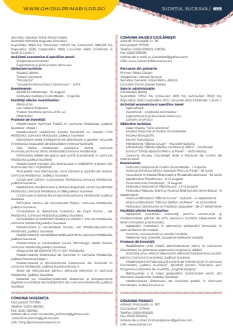 WWW.GHIDULPRIMARIILOR.RO JUDE%u021aUL SUCEAVA / 655Secretar General: Mihai Florin Male%u015fContabil: Mihaela Augusta SimuleacSuprafa%u021ba:%u00a0 9962 ha; Intravilan:%u00a0 100,07 ha; Extravilan:%u00a0 9861,93 ha; Popula%u021bia:%u00a0 5236; Gospod%u0103rii:%u00a0 1999; Locuin%u021be:%u00a0 1690; Gr%u0103dini%u021be:%u00a0 5; %u0218coli:%u00a06; Licee:%u00a01; Activitati economice si specifice zonei:Cre%u015fterea animalelorExploatarea %u015fi prelucrarea lemnuluiObiective turistice:Muzeul s%u0103tescTrasee montane%u201cMoc%u0103ni%u0163a%u201d%u201cAcoper%u0103m%u00e2ntul Maicii Domnului%u201d - schitEvenimente:Serb%u0103rile Moldovi%u0163ei - 15 augustFestivalul ov%u0103lelor %u00eencond%u0103iate - 12 aprilieFacilit%u00e3%u0163i oferite investitorilor:P%u00e2rtii schiiLac natural Pa%u015fcanuTrasee montane pentru ATV-uriP%u0103str%u0103v%u0103riiProiecte de investi%u0163ii:Modernizare Iluminat Public %u00een comuna Moldovi%u021ba, jude%u021bul Suceava%u2013 etapa IModernizare/ reabilitare %u0218coala General%u0103%u00a0 cu clasele I-VIII Moldovi%u021ba, comuna Moldovi%u021ba, jude%u021bul SuceavaDezvoltare re%u021bea inteligent%u0103%u00a0de distribu%u021bie a gazelor naturale %u00een teritoriul Asocia%u021biei de Dezvolatre Intercomunitar%u0103Gaz Valea Moldovi%u021bei (comuna Vama, comuna Frumosu,comuna Vatra Moldovi%u021bei,Comuna Moldovi%u021ba)%u00cenfiin%u021barea re%u021belei de ap%u0103%u00a0%u0219i ap%u0103%u00a0uzat%u0103%u00a0(canalizare) %u00een comuna Moldovi%u021ba,jude%u021bul SuceavaModernizare tronson DC Demacu%u0219a L=0,800KM, tronson DC Putna-Secrie%u0219 L=0,900KMPod peste r%u00e2ul Demacu%u0219a, zona Darieni %u0219i ap%u0103r%u0103ri de maluri, Comuna Moldovi%u021ba, Jude%u021bul SuceavaConstruire C%u0103min Cultural,sat Moldovi%u021ba,comuna Moldovi%u021ba, jude%u021bul SuceavaReabilitare, modernizare %u0219i dotare dispensar uman localitatea Moldovi%u021ba,comuna Moldovi%u021ba,nr.386,jude%u021bul SuceavaConstruire %u0219i dotare Baza Sportiv%u0103,comuna Moldovi%u021ba Jude%u021bul Suceava%u00cenfiin%u021bare centru de recreere,sat R%u00e2%u0219ca, comuna Moldovi%u021ba, jude%u021bul SuceavaConsolidare %u0219i reabilitare Gr%u0103dini%u021ba de Copii Putna , sat Moldovi%u021ba, comuna Moldovi%u021ba,jude%u021bul SuceavaConsolidare %u0219i reabilitare %u0218coala cu clasele I- VIII, sat Moldovi%u021ba, comuna Moldovi%u021ba,jude%u021bul SuceavaModernizare %u0219i consolidare muzeu, sat Moldovi%u021ba,comuna Moldovi%u021ba, jude%u021bul SuceavaModernizare %u0219i consolidare sediu prim%u0103rie, comuna Moldovi%u021ba, jude%u021bul SuceavaModernizare %u0219i consolidare Liceul Tehnologic Vasile Cocea, comuna Moldovi%u021ba,jude%u021bul SuceavaAsigurarea de sisteme TIC %u00een UAT Moldovi%u021baModernizarea Sistemului de iluminat %u00een%u00a0 comuna Moldovi%u021ba, jude%u021bul Suceava etapa IModernizarea %u0219i eficientizarea Sistemului de iluminat %u00een comuna Moldovi%u021ba, jude%u021bul Suceava etapa IISta%u021bii de re%u00eenc%u0103rcare pentru vehicule electrice %u00een comuna Moldovi%u021ba, jude%u021bul SuceavaDotarea cu mobilier,materiale didactice %u0219i echipamente digitale a unit%u0103%u021bilor de %u00eenv%u0103%u021b%u0103m%u00e2nt din comuna Moldovi%u021ba, jude%u021bul SuceavaCOMUNA MU%u015eENI%u0162ACod po%u0219tal: 727390Telefon: 0230-280162; Fax: 0230-280162; Adresa de e-mail: musenita_primarie@yahoo.com achizitiimusenita@yahoo.comURL: http://primariamusenita.roCOMUNA MUZEU CIOC%u0102NE%u015eTIAdres%u0103: Principal%u0103, nr. 39Cod po%u0219tal: 727120Telefon: 0230-578022, 578135; Fax: 0230-578135; Adresa de e-mail: p_ciocanesti@yahoo.comURL: www.ciocanestibucovina.euPersoane din primarie:Primar: Radu%u00a0CiocanViceprimar: Marcel%u00a0:%u015echeulSecretar General: Viorel Petru%u00a0Albot%u0103%u00a0Contabil: Florin Daniel DaneaSate %u00een administra%u021bie:Cioc%u0103ne%u015fti, Boto%u015fSuprafa%u021ba:%u00a0 10741 ha; Intravilan:%u00a0 800 ha; Extravilan:%u00a0 10122 ha; Popula%u021bia:%u00a01522; Gospod%u0103rii:%u00a0672; Locuin%u021be:%u00a0600; Gr%u0103dini%u021be:%u00a01; %u0218coli:%u00a01; Activitati economice si specifice zonei:Agricultur%u0103Zootehnie - cre%u015fterea animalelorExploatarea %u015fi prelucrarea lemnuluiComer%u0163 %u015fi serviciiObiective turistice:Casa-Muzeu %u201c%u0162ara Leontina%u201dMuzeul Na%u0163ional al Ou%u0103lor %u00cencondeiateMuzeul EtnograficMun%u0163ii SuharduluiM%u0103n%u0103stirea %u201cSf%u00e2nta Cruce%u201d - Muntele SuhardM%u0103n%u0103stirea %u201cSf%u00e2ntul %u015etefan cel Mare %u015fi Sf%u00e2nt%u201d - Coc%u0103ne%u015ftiSchitul %u201cSfin%u0163ii Apostoli Petru %u015fi Pavel%u201d - V%u00e2rful Boto%u015fComuna Muzeu Cioc%u0103ne%u015fti este o sta%u0163iune de turism de interes localEvenimente:Festivalul Na%u0163ional al Ou%u0103lor %u00cencondeiate - 1-2 aprilieHramul Schitului Sfin%u0163ii Apostoli Petru %u015fi Pavel - 29 iunieIncursiune %u00een Marea Rezerva%u0163ie a Rhodedendronului - 30 iunieS%u0103pt%u0103m%u00e2na Plut%u0103ritului - 6-12 augustZiua comunei Cioc%u0103ne%u015fti - 15 augustFestivalul Na%u0163ional al P%u0103str%u0103vului - 13-15%u00a0augustFestivalul R%u0103scolu St%u00e2nii %u015fi Hramul Bisericii din lemn Boto%u015f - 8 septembrieHramul M%u0103n%u0103stirii %u201cSf%u00e2nta Cruce%u201d - Suhard - 14 septembrieHramul M%u0103n%u0103stirii %u201cSf%u00e2ntul %u015etefan cel Mare%u201d - 14 octombrieFestivalul Obiceiurilor %u015fi Tradi%u0163ilor populare - 26-27%u00a0decembrieFacilit%u00e3%u0163i oferite investitorilor:A%u015ftept%u0103m investitori interesa%u0163i pentru construc%u0163ia %u015fi modernizarea: p%u00e2rtiei%u00a0 de schi, pensiuni turistice (dispunem de teren intravilan %u015fi extravilan)A%u015ftept%u0103m investitori %u00een domeniul prelucr%u0103rii lemnului, %u00een special fabrici de mobil%u0103%u00a0%u00cenchiriei, concesion%u0103ri %u015fi v%u00e2nz%u0103ri imobileTelefonie fix%u0103, internet, acoperire telefonie mobil%u0103Proi