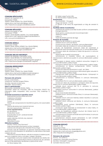 66 / JUDE%u021aUL ARGE%u0218 WWW.GHIDULPRIMARIILOR.ROCOMUNA B%u0102ICULE%u015eTIAdres%u0103: Sat Argesani, nr. 31Cod po%u0219tal: 117065Telefon: 0248-760204; Fax: 0248-760204; Adresa de e-mail: baiculesti@ag.e-adm.roURL: https://www.cjarges.ro/web/baiculesti#COMUNA B%u0102LILE%u015eTIAdres%u0103: Principal%u0103, nr. 169Cod po%u0219tal: 117080Telefon: 0248-562080, 562300 ; Fax: 0248-562080; Adresa de e-mail: registratura@primariabalilesti.roURL: www.primariabalilesti.roCOMUNA B%u00c2RLACod po%u0219tal: 117090Telefon: 0248- 678141, 678201; Fax: 0248-678090; Adresa de e-mail: primariabirla@yahoo.comURL: https://www.cjarges.ro/web/barla#COMUNA BELE%u0162I-NEGRE%u015eTIAdres%u0103: Sat Negre%u015fti; Cod po%u0219tal: 117110Telefon: 0248-657225; Fax: 0248-657225; Adresa de e-mail: primarie@beletinegresti.cjarges.roURL: https://www.cjarges.ro/web/beleti-negrestiCOMUNA BEREVOE%u015eTI Adres%u0103: DC 3, nr. 773Cod po%u0219tal: 117115Telefon: 0248- 572030; Fax: 0248-572030; Adresa de e-mail: primarie@berevoesti.cjarges.roURL: https://primariaberevoesti.weebly.com/Persoane din primarie:Primar: Ionel MaziluViceprimar: Nicolae Dragos P%u00eeslaruSecretar General: Andra%u00a0Leca%u00a0Contabil:%u00a0 Diana%u00a0Cotescu%u00a0Sate %u00een administra%u021bie:Berevoie%u015fti, G%u0103m%u0103ce%u015fti, Bratia, O%u0163eluSuprafa%u021ba:%u00a0 10023 ha; Intravilan:%u00a0 480 ha; Extravilan:%u00a0 9543,11 ha; Popula%u021bia:%u00a0 3289; Gospod%u0103rii:%u00a0 1218; Locuin%u021be:%u00a0 1752; Gr%u0103dini%u021be:%u00a0 3; %u0218coli:%u00a03; Activitati economice si specifice zonei:Exploatarea %u015fi prelucrarea lemnuluiCre%u0219terea animalelorCultivarea cerealelorTurismFabrica de componente SC SILDVB SA pentru SC Automobile Dacia SAFabrica de prelucrare material lemnosFermieri (aproximativ 1500 de oi)Firme reprezentative:SC SILDVB SAProduc%u0103tori locali:6 produc%u0103tori locali - produse lactateProduse locale:Lapte, telemea, br%u00e2nz%u0103, ca%u0219, ca%u0219cavalOportunit%u0103%u021bi: Dezvoltare turism%u00a0Obiective turistice:Muzeul %u201cMihai Tican Rumano%u201dCasa memorial%u0103 a faimosului scriitor interbelicColec%u021bia de art%u0103 (pictur%u0103) a Marietei Proca JingaActuala cas%u0103 de v%u00e2n%u0103toare ce apar%u021bine Direc%u021biei Silvice unde obi%u0219nuia s%u0103 vin%u0103 Ceau%u0219escu la v%u00e2n%u0103toare %u0219i unde exista o faimoas%u0103 cre%u0219tere de ur%u0219iP%u0103str%u0103v%u0103ria Cascada R%u00e2u%u0219or, sala de incuba%u021bie %u0219i cre%u0219tere puiet, precum %u0219i p%u0103str%u0103v matur curcubeu, indigen, f%u00e2nt%u00e2nelCapacitatea comunei noastre este completat%u0103 de relieful din zona R%u00e2u%u0219or, de puritatea R%u00e2ului Bratia %u0219i afluen%u021bii s%u0103i, de calitatea aerului %u0219i de poten%u021bialul v%u00e2n%u0103toresc %u0219i piscicol din zon%u0103SC Perla Vadisor SRLSC Valea Larga Turism SRL SC Sfanta Elena Traditional SRLEvenimente:Ziua localit%u0103%u021bii - 15 augustT%u00e2rgul de Marin%u0103 - 17 iulie%u00cen fiecare zi de mar%u021bi se organizeaz%u0103 un t%u00e2rg de cereale %u00een comun%u0103Facilit%u00e3%u0163i oferite investitorilor:Asisten%u021b%u0103 din partea autorit%u0103%u021bii locale conform competen%u021belorEnergie electric%u0103Teren pentru construirea de microintreprinderiTelefonie mobil%u0103Cablu TVToate facilit%u0103%u021bile permise de legeProiecte de investi%u0163ii:Obiective de investi%u021bii %u00een continuareAsfaltare drum comunal BratiaConstruire pu%u021b cheson, sat Bratia, comuna Berevoie%u0219tiExtindere re%u021bea de canalizare %u00een comuna Berevoie%u0219tiStudiu de fezabilitate construire re%u021bea de canalizare %u0219i echipamente sta%u021bie de epurare etapa a IIa, %u00een comua%u00a0Berevoie%u0219ti%u00cenfiin%u021bare re%u021bea de canalizare %u0219i sta%u021bie de epurare %u00een comuna Berevoie%u0219tiObiective de investi%u021bii noi propuseAchizi%u021bionare %u0219i instalare sistem de supraveghere %u0219i monitorizare a domeniului public %u00een comuna Berevoie%u0219ti. jude%u021bul Arge%u0219Amenajare %u0219i dotare centru medical comunitar integrat %u00een comuna Berevoie%u0219ti, jude%u021bul Arge%u0219%u00cenfiin%u021bare %u0219i dotare parc %u00een comuna Berevoie%u0219ti, jude%u021bul Arge%u0219Achizi%u021bionare %u0219i dotare echipamente C%u0103min Cultural Berevoe%u0219ti, jude%u021bul Arge%u0219Construire re%u021bea de alimentare cu ap%u0103 , sat O%u021belu%u00cenfiin%u021bare sistem de alimentare %u0219i distrubu%u021bie gaze naturale %u00een comuna Berevoe%u0219ti, jude%u021bul Arge%u0219%u00cemprejmuire sta%u021bii pompe Berevoe%u0219ti-Bratia- G%u0103mpce%u0219ti %u00een comuan Berevoe%u0219ti, jude%u021bul Arge%u0219Achizitionare %u0219i montare hidran%u021bi %u00een comuna Berevoe%u0219ti, jude%u021bul Arge%u0219Actualizare PUG %u00een comuna Berevoe%u0219ti, jude%u021bul Arge%u0219Construire re%u021bea de canalizare %u0219i echipare sta%u021bie de epurare, etapa a IIa, %u00een comuan Berevoe%u0219ti, jude%u021bul Arge%u0219Asfalate drum centur%u0103 DN 73 C- prim%u0103rie %u00een comuna Berevoe%u0219ti, jude%u021bul Arge%u0219Asfaltare drumuri comunale %u00een comuna Berevoe%u0219ti, jude%u021bul Arge%u0219, obiectivDrum local strada G%u0103ne%u0219tilorAsfaltare drum comunal strada Z%u0103voi, %u00een comuan Berevoe%u0219ti, jude%u021bul Arge%u0219Asfalatre drum comunal Sr%u00e2mbu-atelier SILDVB, %u00een comuna Berevoe%u0219ti, jude%u021bul Arge%u0219Asfaltare drum comunal sat Bratia, %u00een comuna Berevoe%u0219ti, jude%u021bul Arge%u0219Reabilitare pun%u021bi aeriene G%u0103m%u0103ce%u0219ti, Z%u0103voi, %u00een comuna Berevoe%u0219ti, jude%u021bul Arge%u0219Construire rigole betonate %u0219i transevers%u0103ri %u00een satul O%u021belu, %u00een comuna Berevoe%u0219ti, jude%u021bul Arge%u0219Studiu de fezabilitate asfaltare drumuri de interes local %u00een comuna Berevoe%u0219ti, jude%u021bul Arge%u0219Achizi%u021bionare %u0219i montare central%u0103 termic%u