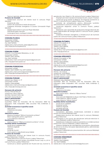 WWW.GHIDULPRIMARIILOR.RO JUDE%u021aUL TELEORMAN / 679 Terenuri agricole, p%u0103%u0219une natural%u0103Proiecte de investi%u0163ii:Modernizare drumuri de interes local %u00een comuna Plopii Sl%u0103vite%u0219tiProiecte de viitorSistem de canalizare %u0219i sta%u021bie de epurareCre%u0219terea eficien%u021bei energetice la %u0218coala Gimnazial%u0103 Plopii Sl%u0103vite%u0219tiModernizare str%u0103zi %u00een comuna Plopii Sl%u0103vite%u0219ti Distribu%u021bie gaze naturaleAmenajare teren multisport sinteticCOMUNA PLOSCACod po%u0219tal: 147265Telefon: 0247-327501; Fax: 0247-327501; Adresa de e-mail: primaria_plosca@yahoo.comURL: https://comunaplosca.ro/COMUNA POENIAdres%u0103: G-ral Gheorghe R%u0103dulescu, nr. 48Cod po%u0219tal: 147270Telefon: 0247-457109; Fax: 0247-457005; Adresa de e-mail: conta.primariapoeni@gmail.comURL: http://primaria-poeni.ro/COMUNA POROSCHIACod po%u0219tal: 147280Telefon: 0247-318787; Fax: 0371-521035; Adresa de e-mail: primariaporoschia@yahoo.comURL: https://primariaporoschia.ro/COMUNA PURANIAdres%u0103: %u015eos. Pite%u015fti, nr. 17Cod po%u0219tal: 147348Telefon: 0760-823681; Adresa de e-mail: primariapurani@yahoo.comURL: https://primariapurani.ro/Persoane din primarie:Primar: Petric%u0103 NeculaViceprimar: Silviu C%u0103praruSecretar General: Geta Li%u0163%u0103Contabil: Viorica BurlacuSate %u00een administra%u021bie:Purani, Puranii de susSuprafa%u021ba:%u00a0 2002 ha; Intravilan:%u00a0 133 ha; Extravilan:%u00a0 1869 ha; Popula%u021bia:%u00a0 1436; Gospod%u0103rii:%u00a0 538; Locuin%u021be:%u00a0 702; Gr%u0103dini%u021be:%u00a0 2; %u0218coli:%u00a01; Activitati economice si specifice zonei:Agricultur%u0103Cre%u015fterea animalelorComer%u0163Obiective turistice:Biserica Ortodox%u0103 %u201cSf%u00e2ntul Constantin %u015fi Elena%u201dBazin hidrografic pentru agrementLunca P%u00e2r%u0103ului GlavaciocEvenimente:Hramul bisericii %u201cSf%u00e2ntul Constantin %u015fi Elena%u201d- 21 maiFacilit%u00e3%u0163i oferite investitorilor:Acces drum jude%u0163ean 503Telefonie digital%u0103InternetFor%u0163%u0103 de munc%u010315 km p%u00e2n%u0103 la calea ferat%u0103 (ora%u015f Videle)Proiecte de investi%u0163ii:Modernizare drumuri de interes local %u00een comuna Purani, jude%u021bul Teleorman- finalizatSta%u021bie electric%u0103 %u00een comuna Purani, jude%u021bul TeleormanReabilitare termic%u0103 %u0218coala Gimnazial%u0103 Purani corp A %u0219i B %u00een comuna Purani, jude%u021bul TeleormanConstruire %u0219i dotare gradini%u021b%u0103 sat Puranii de Sus, Cvartal 14, parcela 454, Sos. Pite%u0219ti nr. 30, comuna Purani, jude%u021bul Teleorman%u00cemprejmuire teren %u0218coala Gimnaziala Purani, corp B- finalizatConstruire grup sanitar la Biserica %u201cSf. %u00cempara%u021bi Constantin %u0219i Elena%u201d %u00een comuna Purani, jude%u021bul Teleorman- finalizatAchizi%u021bie de echipamente pentru efectuarea lucr%u0103rilor administrative %u00een comuna Purani jude%u021bul TeleormanConstruire dispensar uman %u00een comuna Purani, jude%u021bul TeleormanRealizarea unei capacit%u0103%u021bi de producere energie electric%u0103%u00a0din surse regenerabile de energie solar%u0103%u00a0%u00een comuna Purani, jude%u021bul TeleormanCre%u0219terea eficien%u021bei energetice a infrastructurii de iluminat public din comuna Purani, jude%u021bul TeleormanCOMUNA PUTINEIUAdres%u0103: Principal%u0103, nr. 8Cod po%u0219tal: 147285Telefon: 0247-358139; Fax: 0247-358139; Adresa de e-mail: primariaputineiu@yahoo.comURL: http://putineiu.roCOMUNA R%u0102DOIE%u015eTIAdres%u0103: Principal%u0103, nr. 86Cod po%u0219tal: 147290Telefon: 0247-337303; Fax: 0247-337303; Adresa de e-mail: primariaradoiesti@yahoo.comURL: https://comunaradoiestitr.ro/Persoane din primarie:Primar:%u00a0 Ion%u00a0Cioac%u0103%u00a0Viceprimar:%u00a0Ionel%u00a0B%u0103doiSecretar General:%u00a0 Iuliana%u00a0Cazan%u00a0Contabil: Sorina%u00a0%u00a0Lungu%u00a0Sate %u00een administra%u021bie:R%u0103doie%u015fti-Vale, R%u0103doie%u015fti-Deal, CetateaSuprafa%u021ba:%u00a0 3917 ha; Intravilan:%u00a0 343 ha; Extravilan:%u00a0 3574 ha; Popula%u021bia:%u00a0 2290; Gospod%u0103rii:%u00a0 1197; Locuin%u021be:%u00a0 1009; Gr%u0103dini%u021be:%u00a0 2; %u0218coli:%u00a01; Activitati economice si specifice zonei:Agricultur%u0103Cre%u015fterea animalelorObiective turistice:Monument istoric - Biserica %u201cSf%u00e2nta Treime%u201dEvenimente:Ziua comunei R%u0103doie%u015fti (a doua zi de Pa%u015fti, a fiec%u0103rui an)Hram Biserica %u201cSf%u00e2ntu%u00a0Andrei%u201dHram Biserica %u201cSf%u00e2nta Treime%u201dFacilit%u00e3%u0163i oferite investitorilor:Acces drum jude%u0163eanFor%u0163%u0103 de munc%u0103Telefonie digital%u0103Societ%u0103%u0163i agricoleProiecte de investi%u0163ii:Consolidare, demolare, modernizare, extindere %u0219i dotare %u0219coala Gimnazial%u0103 R%u0103doie%u0219ti DealModernizare drumuri de interes local %u00een comuna R%u0103doie%u0219ti, jude%u021bul Teleorman%u00cenfiin%u021barea a unui punct de re%u00eenc%u0103rcare vehicule electrice %u00een comuna R%u0103doie%u0219ti, judetul TeleormanReabilitarea moderat%u0103 a%u00a0sediului prim%u0103riei %u0219i a Unit%u0103%u021bii sanitare publice din comuna R%u0103doie%u0219ti, jude%u021bul TeleormanSisteme nteligente de management local pentru dezvoltarea de servicii %u0219i structuri de sprijin specializate pentru administra%u021bia Publica R%u0103doie%u0219tiDotarea %u00eenv%u0103%u021b%u0103m%u00e2ntului preuniversitar din comuna R%u0103doie%u015fti jude%u021bul TeleormanCOMUNA R%u0102SMIRE%u015eTICod po%u0219tal: 147295Telefon: 0247-328403; Fax: 0247-328566; Adresa de e-mail: primaria.rasmiresti@yahoo.com