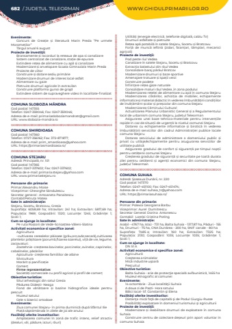 682 / JUDE%u021aUL TELEORMAN WWW.GHIDULPRIMARIILOR.ROEvenimente:Concurs de Crea%u021bie %u0219i literatur%u0103 Marin Preda %u201dPe urmele Morome%u021bilor%u201d T%u00e2rgul anual 6 augustProiecte de investi%u0163ii:Bransamente si racorduri la reteaua de apa si canalizare%u00a0Sistem centralizat de canalizare, sta%u021bie de epurareExtindere re%u021bea de alimentare cu ap%u0103%u00a0%u0219i canalizareModernizare %u0219i anvelopare Scoala Gimnaziala Marin Preda%u00a0Proiecte de viitorConstruire %u0219i dotare sediu prim%u0103rieModernizare drumuri de interes local-asfaltAlimentare cu gazePietruire drumuri agricole %u00een extravilanConstruire platforma gunoi de grajdExtindere sistem de supraveghere video %u00een localitate-finalizatCOMUNA SLOBOZIA M%u00c2NDRACod po%u0219tal: 147355Telefon: 0247-359046; Fax: 0247-359046; Adresa de e-mail: primariasloboziamandratr@gmail.comURL: www.slobozia-mandra.roCOMUNA SMIRDIOASACod po%u0219tal: 147360Telefon: 0727-356162; Fax: 372-871877; Adresa de e-mail: prim_smardioasa@yahoo.comURL: https://primariasmardioasa.ro/COMUNA STEJARUAdres%u0103: Principal%u0103, nr. 101Cod po%u0219tal: 147365Telefon: 0247-337602; Fax: 0247-337602; Adresa de e-mail: primaria.stejaru@yahoo.comURL: www.primariastejaru.roPersoane din primarie:Primar:Alexandru Moise%u00a0Viceprimar: Gheorghe S%u0103ndulescu%u00a0Secretar general : Antoaneta PanaitescuContabil:Petru%u021ba MateaSate %u00een administra%u021bie:Stejaru, Socetu, Bratcovu, GresiaSuprafa%u021ba:%u00a0 6058,69 ha; Intravilan:%u00a0 241 ha; Extravilan:%u00a0 5817,69 ha; Popula%u021bia:%u00a0 1969; Gospod%u0103rii:%u00a0 1320; Locuin%u021be:%u00a0 1245; Gr%u0103dini%u021be:%u00a0 1; %u0218coli:%u00a01; Cum se ajunge in localitate:Pe ruta Ro%u0219iorii de Vede-Scrioa%u021btea-V%u0103leni-SlatinaActivitati economice si specifice zonei:Agricultura %u2013cultivarea cerealelor p%u0103ioase (gr%u00e2u,orz,ov%u0103z,secar%u0103),cultivarea plantelor pr%u0103%u0219itoare (porumb,floarea soarelui), vi%u021b%u0103 de vie, legume, zarzavaturi.Zootehnie- cre%u0219terea bovinelor, porcinelor, ovinelor, caprinelor, cabalinelor, p%u0103s%u0103rilorApicultura- cre%u0219terea familiilor de albineSilviculturaMor%u0103rit %u0219i panifica%u021bieComer%u021bFirme reprezentative:Societ%u0103%u021bi comerciale cu profil agricol %u0219i profil de comer%u021bObiective turistice:Situl arheologic din satul GresiaP%u0103durea Dide%u0219ti- NeagaFond de v%u00e2n%u0103toare %u0219i bazine hidrografice ideale pentru pescuitMuzeul satuluiCele 4 biserici ortodoxeEvenimente:Ziua comunei Stejaru- %u00een prima duminic%u0103 dup%u0103 Sf%u00e2ntul IliePia%u021b%u0103 s%u0103pt%u0103m%u00e2nala %u00een zilele de joi ale anuluiFacilit%u00e3%u0163i oferite investitorilor:Amplasarea comunei %u00een zon%u0103 de trafic intens, relief atractiv (dealuri, v%u0103i, p%u0103dure, iazuri, r%u00e2uri)Utilit%u0103%u021bi (energie electric%u0103, telefonie digital%u0103, cablu TV)Drumuri asfaltate %u0219i pietruiteRe%u021bea ap%u0103 potabil%u0103 %u00een satele Stejaru, Socetu %u0219i BratcovuFor%u021b%u0103 de munc%u0103 ieftin%u0103 (zidari, faian%u021bari, t%u00e2mplari, mecanici agricoli)Proiecte de investi%u0163ii:Pod peste r%u00eeul VedeaCanalizare %u00een satele Stejaru, Socetu %u0219i BratcovuExtrac%u021bia balastului din r%u00e2ul VedeaConsolidare baraj p%u00e2r%u00e2ul BratcovModernizare drumuri %u0219i baze sportiveAmenajare trotuare %u0219i spa%u021bii verziConstruire pode%u021be%u00cenfiin%u021bare re%u021bea gaze naturaleConsolidare maluri r%u00e2ul Vedea ,%u00een zona poduluiModernizarea re%u021belei de alimentare cu ap%u0103 %u00een comuna StejaruModernizarea cl%u0103dirilor, achizi%u021bia de mobilier, echipamente informatice %u0219i material didactic %u00een vederea %u00eembun%u0103t%u0103%u021birii condi%u021biilor de %u00eenv%u0103%u021b%u0103m%u00e2nt %u0219colar %u0219i pre%u0219colar din comuna StejaruModernizarea C%u0103minului CulturalActualizarea Planului Urbanistic General %u0219i a Regulamentului local de urbanism comuna Stejaru, jude%u021bul TeleormanAsigurarea unei baze tehnico-materiale pentru interven%u021biile rapide %u00een caz de situa%u021bii de urgen%u021b%u0103 la nivelul comunei StejaruDotarea cu echipamente informatice %u0219i birotic%u0103 %u00een vederea %u00eembun%u0103t%u0103%u021birii serviciilor din cadrul Administra%u021biei publice locale comuna StejaruDotarea serviciului de administrare a domeniului public %u0219i privat cu utilaje/echipamente pentru asugurarea serviciilor de utilitate public%u0103Asigurarea gradului de confort %u0219i siguran%u021b%u0103 pe timpul nop%u021bii pentru cet%u0103%u021benii comunei StejaruCre%u0219terea gradului de siguran%u021b%u0103 %u0219i securitate pe toat%u0103%u00a0durata zilei pentru cet%u0103%u021benii %u0219i agen%u021bii economici din comuna Stejaru, jude%u021bul TeleormanCOMUNA SUHAIAAdres%u0103: %u015eoseaua Dun%u0103rii, nr. 220Cod po%u0219tal: 147370Telefon: 0247-451100; Fax: 0247-451474; Adresa de e-mail: suhaia_tr@yahoo.comURL: https://primariasuhaia.ro/Persoane din primarie:Primar: Polexia Georgiana%u00a0BarbuViceprimar: Aurel%u00a0%u00a0Dumitrescu%u00a0Secretar General: Dorina%u00a0%u00a0AntonescuContabil:%u00a0 Lorelai Cristina%u00a0Pot%u00eeng%u00a0Sate %u00een administra%u021bie:Arabil - 4767 ha, Islaz - 731 ha, Balta Suhaia - 1317,87 ha, P%u0103duri - 155 ha, Drumuri - 75 ha, CNA Dun%u0103rea - 200 ha, SNIF canale - 80 haSuprafa%u021ba:%u00a0 7485 a; Intravilan:%u00a0 160 ha; Extravilan:%u00a0 7325 ha; Popula%u021bia:%u00a0 2130; Gospod%u0103rii:%u00a0 1035; Locuin%u021be:%u00a0 1035; Gr%u0103dini%u021be:%u00a0 1; %u0218coli:%u00a01; Cum se ajunge in localitate:DN 51 AActivitati economice si specifice zonei:Agricultur%u0103Cre%u015fterea animalelorMic%u0103 industrie u%u015foar%u0103 PescuitulObiective turistice:Balta Suhaia - arie de protec%u0163ie special%u0103 avifaunistic%u0103, 1455 haMuzeul etnografic al comuneiEvenimente:14 octombrie - Ziua localit%u0103%u016