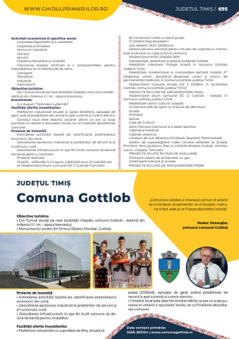 WWW.GHIDULPRIMARIILOR.RO JUDE%u021aUL TIMI%u0218 / 695Activitati economice si specifice zonei:Cultivarea legumelor %u015fi a cerealelorCre%u015fterea animalelorMunca %u00een industrie%u00a0Comer%u0163ServiciiIndustrie t%u00e2mpl%u0103rie %u015fi mobilierFabricarea brazilor artificiali %u015fi a componentelor pentru %u00eempodobirea lor la s%u0103rb%u0103torile de iarnaTransportT%u00e2mpl%u0103rieIndustrieAgricultur%u0103%u00a0Obiective turistice:Doi Tumuli situa%u0163i pe raza localit%u0103%u0163ii Vizejdia, comuna Gottlob - dat%u00e2nd din mileniul II %u00ee. Hr. - epoca bronzuluiEvenimente:3-4 August %u201cFestivalul Lubeni%u0163ei%u201dFacilit%u00e3%u0163i oferite investitorilor:Platform%u0103 industrial%u0103 situat%u0103 la %u015fosea (DJ594A), aproape de gar%u0103, av%u00e2nd posibilitate de racord la ap%u0103 curent%u0103 %u015fi curent electricConsiliul local este deschis oric%u0103rei oferte ce are ca scop punerea %u00een valoare a resurselor locale, iar ca finalitate dezvoltarea comuneiProiecte de investi%u0163ii: Extinderea activit%u0103%u0163ii bazat%u0103 pe valorificarea poten%u0163ialului economic din zon%u0103Dezvoltarea sectorului industrial al prest%u0103riilor de servicii %u015fi al turismului ruralDezvoltarea infrastructurii %u00een a%u015fa fel %u00eenc%u00e2t comuna s%u0103 devin%u0103 tentant%u0103 pentru investitoriProiecte realizateFEADR %u2013 M%u0102SURA 3.2.2 aprox 2.500.000 euro (11.446.300 lei)A) Modernizare Drum comunal DC 11 Gottlob-TomnaticB) Construire Cre%u0219%u0103 cu dou%u0103 grupeC) Dotare t%u00e2rg de pepeniGAL BANAT VEST JIMBOLIADotare serviciu voluntar pentru situa%u021bii de urgen%u021b%u0103 cu tractor, bra%u021b %u00eenc%u0103rcare cu cup%u0103 %u0219i furc%u0103, remorc%u0103Modernizare str%u0103zi Vizejdia 3KMMansardare, reabilitare %u0219i dotare Gr%u0103din%u021b%u0103%u00a0GottlobReabilit%u0103ri interioare finisaje %u0218coal%u0103 %u00een comuna Gottlob, Jude%u021bul Timi%u0219Reabilitare, modernizare %u0219i mansardare par%u021bial%u0103 mobil%u0103%u00a0 %u201eP%u201d Dispensar uman, rezult%u00e2nd dispensar uman %u0219i centru de permanen%u021b%u0103 medical%u0103, %u00een comuna Gottlob, jude%u021bul Timi%u0219Modernizare trotuare strada DS 3 (DJ594) %u00een localitatea Gottlob, Comuna Gottlob, jude%u021bul Timi%u0219%u201dPROIECTE %u00ceN CURS DE IMPLEMENTARE PNDL: Modernizare drum comunal DC 12 Gottlob - Vizejda, %u00een Comuna Gottlob, jude%u021bul Timi%u0219Reabilitare c%u0103min cultural VizejdiaConstruire sal%u0103 de sport cu tribun%u0103 de 180 locuri%u0218coalaPrim%u0103rieSalin%u0103Casa de Cultur%u0103Zona Parcului Comunal %u0219i a bazei sportiveCabinetul medicalCabinet veterinarLoca%u0219uri de cult (Biserica Ortodox%u0103, Baptist%u0103, Penticostal%u0103)Sistem de supraveghere video camere asfaltate la: %u0218coal%u0103, Prim%u0103rie, Sens giratoriu, Parc %u0219i intr%u0103rile dinspre Graba%u021bi, Comlo%u0219, Lovrin, Vizejdia, TomnaticPROIECTE AFLATE %u00ceN FAZA DE EVALUARE:%u00cenfiin%u021bare sistem de alimentare cu gazAmenajare trotuare %u0219i accesePROIECTE %u00ceN CURS DE IMPLEMENTARE PNRR: