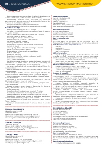 716 / JUDE%u021aUL TULCEA WWW.GHIDULPRIMARIILOR.ROExisten%u0163a programelor comunitare %u015fi na%u0163ionale de asigurare a accesului la educa%u0163ie pentru popula%u0163ia dezavantajate;Posibilitatea acces%u0103rii unor programe de finan%u0163are guvernamentale pentru reconversie profesional%u0103 %u015fi crearea de noi locuri de munc%u0103 pentru %u015fomeri;Poten%u0163ial important al for%u0163ei de munc%u0103 locale;Implicarea autorit%u0103%u0163ilor locale %u00een problemele comunit%u0103%u0163ii.Proiecte de investi%u0163ii:Reabilitare %u015fi modernizare str%u0103zi - finalizatCanalizare menajer%u0103 %u00een sistem centralizat %u015fi sta%u0163i de tratare ape uzate - finalizatCentrul de asisten%u0163%u0103 dup%u0103 programul %u015fcolar - finalizatAchizi%u0163ie tractor cu remorc%u0103 - relizatHora Ple%u015foaiei - tradi%u0163ie %u015fi continuitateReabilitare %u015fcoal%u0103 cu clasele I%u00a0- VIII - finalizatConsolidare biseric%u0103 - realizatAmenajare spa%u0163ii verzi - realizatBaz%u0103 sportiv%u0103 multifunc%u0163ional%u0103 model tip II - realizatCarier%u0103 de piatr%u0103Amenajare %u015fi dotare cabinet stomatologic - realizatRepara%u0163ii drumuri s%u0103te%u015fti - realizat%u00cembun%u0103t%u0103%u0163irea infrastructurii comunei D%u0103eniCultur%u0103 %u015fi educa%u0163ieProtejarea mediuluiDezvoltarea serviciilor publice, medicale %u015fi socialeDezvoltarea economic%u0103Sport, turism %u015fi agrementParticiparea civic%u0103 - implicarea cet%u0103%u0163enilor %u00een via%u0163a comunit%u0103%u0163iiConstruire %u0219i dotare centru medical de permanen%u021b%u0103 %u00een comuna D%u0103eni, jude%u021bul Tulcea - in curs de realizareConstruire sediu prim%u0103rie %u00een comuna D%u0103eni, jude%u021bul Tulcea - %u00een curs de realizareReabilitare re%u021bea de ap%u0103 %u00een comuna D%u0103eni, jude%u021bul Tulcea - %u00een curs de realizare%u00cembun%u0103t%u0103%u021birea calit%u0103%u021bii traficului pietonal prin %u00eenfiin%u021bare de trotuare %u00een comuna D%u0103eni, jude%u021bul Tulcea - %u00een curs de realizareModernizare drum canton, %u00een Comuna D%u0103eni, jude%u021bul Tulcea - %u00een curs de realizareExtindere %u0219i modernizare re%u021bea de canalizare %u00een Comuna D%u0103eni, jude%u021bul Tulcea - %u00een curs de realizareExtindere str%u0103zi %u0219i trotuare %u00een Comuna D%u0103eni, jude%u021bul Tulcea - %u00een curs de realizareDotare, mobilare Centru Integrat Comunitar %u00een Comuna D%u0103eni, jude%u021bul Tulcea - %u00een curs de realizareProiecte realizate:Reabilitare %u0218coal%u0103 cu dou%u0103 clase %u201eAronic%u0103%u201d- finalizatExtindere %u0219i modernizare iluminat public- finalizatModernizare drum de acces sta%u021bie de tratare ap%u0103- finalizatReabilitare, modernizare, dotare %u0219i extindere asez%u0103m%u00e2nt cultural %u00een comuna D%u0103eni, jude%u021bul Tulcea- finalizatModernizare str%u0103zi de interes local %u00een Comuna D%u0103eni, jude%u021bul Tulcea - finalizat Construire sal%u0103 de sport %u0219colar%u0103%u00a0%u00een comuna D%u0103eni- %u00een curs de finalizareCOMUNA DOROBAN%u0162UAdres%u0103: Prim%u0103verii, nr. 45Cod po%u0219tal: 827070Telefon: 0240-576306; Fax: 0240-576426, 576303; Adresa de e-mail: consiliul_dorobantu@yahoo.comURL: www.primariadorobantu.paginadestart.comCOMUNA FREC%u0102%u0162EICod po%u0219tal: 827075Telefon: 0240-548291; Fax: 0240-548291; Adresa de e-mail: primaria_frecatei@yahoo.comURL: www.primariafrecatei.roCOMUNA GRECIAdres%u0103: 1 Decembrie, nr. 16Cod po%u0219tal: 827080Telefon: 0240-575051; Fax: 0240-708945; Adresa de e-mail: primariacomuneigreci@yahoo.comURL: https://www.primariagreci.ro/COMUNA GRINDUAdres%u0103: Principal%u0103, nr. 50Cod po%u0219tal: 827085Telefon: 0340-501001; Fax: 0340-501001; Adresa de e-mail: primaria.grindu@yahoo.comURL: www.comunagrindutl.roPersoane din primarie:Primar: Neculai NeaguViceprimar: Florentina Enic%u0103Secretar General: Ion CristeaContabil: Florentina FranguleaSate %u00een administra%u021bie:GrinduSuprafa%u021ba:%u00a0 8820 ha; Intravilan:%u00a0 218 ha; Extravilan:%u00a0 8610 ha; Popula%u021bia:%u00a01271; Gospod%u0103rii:%u00a0650; Locuin%u021be:%u00a0474; Gr%u0103dini%u021be:%u00a01; %u0218coli:%u00a01; Activitati economice si specifice zonei:Comer%u0163Agricultur%u0103Cre%u015fterea animalelorPescuitul industrial%u00a0Obiective turistice:Capel%u0103 cu grup monumental - %u00eenchinat victimelor celor dou%u0103 r%u0103zboaie mondiale - locuitori ai comunei Grindu %u015fi a victimelor accidentului naval Mogo%u015foia (223 %u00eenneca%u0163i - 10 septembrie 1989)Biserica veche cu Hramul %u201cSf%u00e2ntul Nicolae%u201dCotul Pisicii - cea mai mare curbur%u0103 a fluviului Dun%u0103rea %u015fi cea mai mare ad%u00e2ncime (40 metri), unde se poate face pescuit sportivFacilit%u00e3%u0163i oferite investitorilor:Concesionare teren %u00een condi%u0163ii avantajoaseScutire (diminuare) taxe %u015fi impozite conform legiiAcces la re%u0163eaua de ap%u0103 potabil%u0103For%u0163%u0103 de munc%u0103 local%u0103Proiecte de investi%u0163ii:Proiectul na%u021bional pentru dezvoltare rurala- %u201cC%u0103min cultural %u00een comuna Grindu, Tulcea%u201d- fonduri europeneProiect%u201d %u00cenfiin%u021barea unui centru de colectare a de%u0219eurilor prin aport voluntar %u00een comuna Grindu, jude%u021bul Tulcea%u201d -finan%u021bat prin planul na%u021bional de redresare %u0219i rezilien%u021b%u0103Proiect %u201dDotarea cu mobilier, materiale didactice %u0219i echipamente digitale a %u0219colii gimnaziale %u201cNicolae Iorga%u201dProiect %u201cExecu%u021bia lucr%u0103rilor de construc%u021bie remiz%u0103%u00a0vehicule %u00een localitatea Grindu, jude%u021bul Tulcea%u201d - bugetul localProiect %u201cExecu%u021bia lucr%u0103rilor de construc%u021bie pia%u021ba public%u0103%u00a0 agroalimentar%u0103%u00a0 %u00een comuna Grindu, jude%u021bul Tulcea%u201d- bugetul localProiect %u201cExecu%u021bia lucr%u0103rilor de construc%u021bie capel%u0103%u00