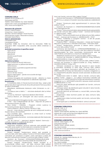 718 / JUDE%u021aUL TULCEA WWW.GHIDULPRIMARIILOR.ROCOMUNA JIJILAAdres%u0103: str.Principala nr.77Cod po%u0219tal: 827110Telefon: 0240-550002; Fax: 0240-550002; Adresa de e-mail: prmrjijila@yahoo.comURL: www.comunajijila.roPersoane din primarie:Primar: Costic%u0103 DeacuViceprimar: Viorel CiobanuSecretar General Delegat: Viorel EnacheAdministrator public: Alexandrina DeacuContabil: Maria PetruSate %u00een administra%u021bie:Localitatea JijilaLocalitatea Garv%u0103nSuprafa%u021ba:%u00a0 12385 ha; Intravilan:%u00a0 402 ha; Extravilan:%u00a0 11983 ha; Popula%u021bia:%u00a0 5967; Gospod%u0103rii:%u00a0 2216; Locuin%u021be:%u00a0 2800; Gr%u0103dini%u021be:%u00a0 2; %u0218coli:%u00a02; Activitati economice si specifice zonei:Agricultur%u0103Silvicultur%u0103Apicultur%u0103Mor%u0103rit %u015fi panifica%u021bieComer%u021bPrest%u0103ri serviciiObiective turistice:Parcul Na%u0163ional Mun%u0163ii M%u0103cinuluiValea Sulucului cu p%u0103dure de salc%u00e2mV%u00e2rful SulucuV%u00e2rful Cheia cu pantele acoperite de liliacV%u00e2rful B%u0103%u015ficaP%u0103durea Mic%u0103Izvorul de leac SulucuBujorul dobrogean - plante rare ocrotite de legeP%u0103durea de teiCetatea Dinoge%u0163ia din localitatea Garv%u0103n - obiectiv cu mare poten%u0163ial turistic zonal neexploatat la adev%u0103rat%u0103 capacitateEvenimente:%u00cen localitatea Jijilia, %u00een fiecare duminic%u0103 este t%u00e2rg - pia%u0163%u0103 unde at%u00e2t produc%u0103torii agricoli locali c%u00e2t %u015fi alte persoane fizice %u015fi juridice %u00ee%u015fi expun produsele;Boboteaza, s%u0103rb%u0103toarea%u00a0 botezului cailor (%u00eentrecere cu cai %u2013 concurs),,La steaua care-a r%u0103s%u0103rit%u2026%u201d %u2013 Activitate dedicat%u0103 zilei lui Mihai Eminescu,,E ziua ta, m%u0103mico!%u201d- Spectacol dedicat Zilei FemeiiHramul Bisericii ,,Sf. Gheorghe%u201d din satul Garv%u0103n, com.una JijilaHramul M%u0103n%u0103stirii Dinoge%u021bia Garv%u0103n ,,Izvorul T%u0103m%u0103duirii%u201d9 Mai %u2013 Ziua Independen%u021bei de Stat - Depuneri de jerbe la Monumentul Eroilor din JijilaZiua Eroilor %u2013 %u00cen%u0103l%u021barea %u2013 Program artistic sus%u021binut la Monumentul Eroilor de la Parohia I JijilaHramul Bisericii ,,Sf%u00e2nta Treime%u201d Parohia II JijilaZiua iei %u2013 Hora satului, Expozi%u021bie de art%u0103 tradi%u021bional%u0103 local%u0103 la Muzeul satului din localitateZiua localit%u0103%u021bii Jijila%u00a0 %u2013 spectacol cu arti%u0219ti locali %u0219i invita%u021bi speciali; (luna septembrie)Ziua Na%u021bional%u0103 a Rom%u00e2niei - Activitate dedicat%u0103%u00a0Zilei Na%u021bionale a Rom%u00e2niei,,Vis de Cr%u0103ciun%u201d %u2013 spectacol dedicat Na%u0219terii Domnului %u2013 colinde %u0219i obiceiuri tradi%u021bionale de iarn%u0103Facilit%u00e3%u0163i oferite investitorilor:Asigurarea utilit%u0103%u021bilor: drumuri pietruite, ap%u0103 potabil%u0103, gaze naturale, acces public la informa%u021bie prin conectare la internetFacilit%u0103%u021bi fiscale (conform prevederilor Codului Fiscal)Proiecte de investi%u0163ii:Proiect integrat: %u201dModernizare sistem ap%u0103 potabil%u0103 %u00een comuna Jijila, satul Jijila, jude%u0219ul Tulcea %u0219i %u00eenfiin%u021bare sistem public centralizat de canalizare al apelor uzate menajere %u0219i sta%u021bie de epurare a efluentului menajer %u00een comuna Jijila, jude%u021bul Tulcea%u201dContract de finan%u021bare C0720A0100117230004/16.02.2018 - PNDR 7.2 cu o finan%u021bare nerambursabil%u0103 de 5.643.595,72 leiProiect integrat: %u201dModernizarea re%u021belei stradale %u0219i a drumurilorde interes local%u00a0 , sat Jijila, comuna Jijila, jude%u021bul Tulcea%u00a0%u0219i modernizarea re%u021belei stradale %u0219i a drumurilor de interes local, sat%u00a0Garv%u0103n, comuna Jijila, jude%u021bul Tulcea%u201dContract de finan%u021bare nr. C0720R010021723800020/05.03.2018; PNDR 7.2 cu o valoare a finan%u021b%u0103rii nerambursabile de 4.658.500,00 leiProiect: %u201dConstruire pia%u021b%u0103 agroalimentar%u0103 %u00een%u00a0 comuna Jijila, jude%u021bul Tulcea%u201dContract de finan%u021bare nr. C1920072X203923801113/24.10.2018 GAL-Dobrogea de NorProiect: %u201d%u00cenlocuire %u0219i extindere re%u021bea de distribu%u021bie%u00a0ap%u0103 potabil%u0103, sat Garv%u0103n comuna Jijila, jude%u021bul Tulcea%u201d - Contract de finan%u021bare nr. 1682/11.10.2017 %u2013 PNDLProiect: %u201dConstruire %u0219coal%u0103 nou%u0103, sat Jijila,comuna Jijila, jude%u021bul Tulcea%u201d; - Contract de finan%u021bare nr. 4351/28.05.2019 %u2013 P.O.RProiect: %u201dGr%u0103dini%u021b%u0103 cu program normal %u2013 6 s%u0103li de grup%u0103, comuna Jijila, jude%u021bul Tulcea%u201dProiectul PRET %u2013 Ministerul Educa%u021biei + Cerere de finan%u021bare depus%u0103 %u00een parteneriat cu Ministerul Educa%u021biei %u2013 POR 2014-2020Proiect: %u201dModernizare, renovare %u0219i dotare c%u0103min cultural comuna Jijila, jude%u021bul Tulcea%u201dContractul de finan%u021bare nr. C0760C0I0031923800006 cu o valoare total%u0103 eligibil%u0103 a Proiectului care face obiectul finan%u021b%u0103rii nerambursabile de c%u0103tre Autoritatea Contractant%u0103 este de 1.533.711,99 lei, echivalentul a maximum 320.659 euroReabilitare infrastructur%u0103 %u00een comuna Jijila, jude%u021bul TulceaContract de finan%u021bare nr. 6505/14.12.2018 (nr. %u00eenreg. MDRAP)/ 4444/20.12.2018 (nr. %u00eenreg. Comuna Jijila)Modernizare drumuri locale %u00een comuna Jijila, jude%u021bul Tulcea%u00a0- Contract de finan%u021bare nr. 6504/14.12.2018 (nr. %u00eenreg. MDRAP) / 4443/20.12.2018 (nr. %u00eenreg. UAT)%u00cenfiin%u021bare%u00a0 canalizare cu sta%u021bie de epurare%u00a0 %u00een satul Garv%u0103n %u0219i extindere canalizare %u00een satul Jijila,%u00a0 comuna Jijila, jude%u021bul Tulcea-%u00a0 %u00a0 %u00a0 S-a depus Formularul solicit%u0103rii de finan%u021bare cu nr. 1878/11.06.2019 la Fondul de Dezvoltare %u0219i Investi%u021bii, %u00eenregistrat cu nr. 2472/CNSP/14.06.2019; Valoarea total%u0103 solicitat%u0103: