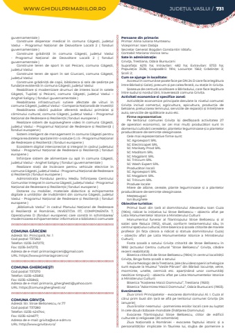 WWW.GHIDULPRIMARIILOR.RO JUDE%u021aUL VASLUI / 731guvernamentale )Construire dispensar medical %u00een comuna G%u0103ge%u0219ti, jude%u021bul Vaslui - Programul Na%u021bional de Dezvoltare Local%u0103 2 ( fonduri guvernamentale )Construire gr%u0103dini%u021b%u0103 %u00een comuna G%u0103ge%u0219ti, jude%u021bul Vaslui - Programul Na%u021bional de Dezvoltare Local%u0103 2 ( fonduri guvernamentale )Construire teren de sport %u00een sat Peicani, comuna G%u0103ge%u0219ti, jude%u021bul VasluiConstruire teren de sport %u00een sat Giurcani, comuna G%u0103ge%u0219ti, jude%u021bul VasluiConstruire gr%u0103dini%u021b%u0103 de copii, biblioteca %u0219i sala de %u0219edin%u021be pe funda%u021bie existent%u0103 %u00een comuna G%u0103ge%u0219ti, jude%u021bul VasluiReabilitare %u0219i modernizare drumuri de interes local %u00een satele G%u0103ge%u0219ti, Tupila%u021bi %u0219i Peicani, comuna G%u0103ge%u0219ti, jude%u021bul Vaslui %u2013 Anghel Saligny ( fonduri guvernamentale )Reabilitarea infrastructurii rutiere afectate de viituri %u00een comuna G%u0103ge%u0219ti, jude%u021bul Vaslui %u2013 Compania Na%u021bional%u0103 de Investi%u021biiReabilitarea cl%u0103dirii publice aferent%u0103 sediului prim%u0103riei %u0219i c%u0103minului cultural, comuna G%u0103ge%u0219ti, jude%u021bul Vaslui %u2013 Programul Na%u021bional de Redresare %u0219i Rezilien%u021b%u0103 ( fonduri europene )Realizare sistem de supraveghere video %u00een comuna G%u0103ge%u0219ti, jude%u021bul Vaslui - Programul Na%u021bional de Redresare %u0219i Rezilien%u021b%u0103 ( fonduri europene )Sistem inteligent de management %u00een comuna G%u0103ge%u0219ti pentru integrarea datelor spa%u021biale %u00eentr-o solu%u021bie G.I.S - Programul Na%u021bional de Redresare %u0219i Rezilien%u021b%u0103 ( fonduri europene )Ecosistem digital interconectat %u0219i integrat %u00een cadrul jude%u021bului Vaslui - Programul Na%u021bional de Redresare %u0219i Rezilien%u021b%u0103 ( fonduri europene )%u00cenfiin%u021bare sistem de alimentare cu ap%u0103 %u00een comuna G%u0103ge%u0219ti, jude%u021bul Vaslui - Anghel Saligny ( fonduri guvernamentale )Realizare sta%u021bii de %u00eenc%u0103rcare pentru vehicule electrice %u00een comuna G%u0103ge%u0219ti, jude%u021bul Vaslui - Programul Na%u021bional de Redresare %u0219i Rezilien%u021b%u0103 ( fonduri europene )Administra%u021bia Fondului pentru Mediu %u00cenfiin%u021barea Centrului Comunitar Integrat %u00een comuna G%u0103ge%u0219ti, jude%u021bul Vaslui - Programul Na%u021bional de Redresare %u0219i Rezilien%u021b%u0103 ( fonduri europene )Dotarea cu mobilier, materiale didactice %u0219i echipamente digitale a unit%u0103%u021bilor de %u00eenv%u0103%u021b%u0103m%u00e2nt din comuna G%u0103ge%u0219ti, jude%u021bul Vaslui - Programul Na%u021bional de Redresare %u0219i Rezilien%u021b%u0103 ( fonduri europene ) %u201eBiblioHub Vaslui%u201d %u00een cadrul Planului Na%u021bional de Redresare %u0219i Rezilien%u021b%u0103 al Rom%u00e2niei, INVESTI%u021aIA I17, COMPONENTA 7, Opera%u021biunea D (fonduri europene) care const%u0103 %u00een schimbarea/modernizarea echipamentelor informatice a bibliotecii comunaleCOMUNA G%u00c2RCENIAdres%u0103: Str. Principal%u0103, Nr. 1Cod po%u0219tal: 737260Telefon: 0235-347273; Fax: 0235-347273; Adresa de e-mail: primariagirceni@gmail.comURL: https://www.primariagirceni.ro/COMUNA GHERGHE%u015eTICod po%u0219tal: 737270Telefon: 0235-435812; Fax: 0235-435845; Adresa de e-mail: primaria_gherghesti@yahoo.comURL: https://comunagherghesti.ro/COMUNA GRIVI%u0162AAdres%u0103: Str. Stroe Bellonescu, nr.77Cod po%u0219tal: 737280Telefon: 0235-424744; Fax: 0235-424677; Adresa de e-mail: grivita@vs.e-adm.roURL: http://www.grivitavs.ro/Persoane din primarie:Primar: Alina Iuliana MunteanuViceprimar: Ioan DabijaSecretar General: Bogdan Constantin V%u0103tafuContabil: Mariana Viorica IanuSate %u00een administra%u021bie:Grivi%u0163a, Trestiana, Odaia BursucaniSuprafa%u021ba:%u00a0 6215 ha; Intravilan:%u00a0 482 ha; Extravilan:%u00a0 5733 ha; Popula%u021bia:%u00a0 3536; Gospod%u0103rii:%u00a0 1914; Locuin%u021be:%u00a0 1562; Gr%u0103dini%u021be:%u00a0 3; %u0218coli:%u00a02; Cum se ajunge in localitate:Accesul %u00een comun%u0103 se poate face pe DN 24 D care face leg%u0103tura %u00eentre B%u00e2rlad %u0219i Gala%u021bi, precum %u0219i pe calea ferat%u0103, cu sta%u021bie %u00een Grivi%u021ba. %u0218oseaua de centur%u0103 ocolitoare a B%u00e2rladului, care face leg%u0103tura %u00eentre sudul %u0219i nordul %u021b%u0103rii, traverseaz%u0103 comuna Grivi%u021ba.Activitati economice si specifice zonei:Activit%u0103%u021bile economice principale derulate la nivelul comunei Grivi%u021ba includ comer%u021bul, agricultura, apicultura, produc%u021bia de betoane, prelucrarea lemnului, serviciile de repara%u021bii %u0219i %u00eentre%u021binere auto, serviciile de sp%u0103l%u0103torie auto etc.Firme reprezentative:Pe teritoriul comunei Grivi%u021ba %u00ee%u0219i desf%u0103%u0219oar%u0103 activitatea 27 de operatori economici, iar cei mai mul%u021bi produc%u0103tori sunt %u00een domeniul cultiv%u0103rii cerealelor, plantelor leguminoase %u0219i a plantelor produc%u0103toare de semin%u021be oleaginoase.Cele mai reprezentative firme sunt:SC Agroexport SRLSC Electricopet SRLSC Marikaty Prod SRLSC Maditom SRLSC Magplant SRLSC Triticum SRLSC Wash Expert SRLProduc%u0103tori locali:SC Agroexport SRLSC Magplant SRLSC Triticum SRLProduse locale: Miere de albine, cereale, plante leguminoase %u0219i a plantelor produc%u0103toare de semin%u021be oleaginoase.Me%u0219te%u0219ugari: Ion BurgheleObiective turistice:Primul bust din %u021bar%u0103 al domnitorului Alexandru Ioan Cuza (1904), ridicat la ini%u021biativa lui Stroe Belloescu %u2013 obiectiv aflat pe Lista Monumentelor Istorice a Ministerului CulturiiMonumentul funerar al filantropului Stroe Belloescu %u0219i al so%u021biei sale Raluca (1912), situat, conform testamentului s%u0103u, %u00een centrul spa%u021biului cultural, %u00eentre biserica %u0219i %u0219coala ctitorite de mar