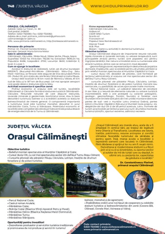 ORA%u0218UL C%u0102LIM%u0102NE%u015eTI Adres%u0103: Calea lui Traian, nr. 80Cod po%u0219tal: 245600Telefon: 0250-750080; Fax: 0250-750082; Adresa de e-mail: primaria_calimanesti@yahoo.comcalimanesti@vl.e-adm.roURL: www.primaria-calimanesti.ro, http://viziteazacalimanesti.roPersoane din primarie:Primar: Dr. Florinel ConstantinescuSecretar General: Maria Simina NistorSate %u00een administra%u021bie:C%u0103lim%u0103ne%u015fti, C%u0103ciulata, Jiblea Nou%u0103, Jiblea Veche, P%u0103u%u015fa, SeacaSuprafa%u021ba:%u00a010453 ha; Intravilan:%u00a0762,66 ha; Extravilan:%u00a09690,34 ha; Popula%u021bia:%u00a0 8496; Gospod%u0103rii:%u00a0 2700; Locuin%u021be:%u00a0 3600; Gr%u0103dini%u021be:%u00a0 3; %u0218coli:%u00a03; Licee:%u00a01; Cum se ajunge in localitate:Accesul %u00een sta%u021biune se realizeaz%u0103, rutier, pe drumul euroepan E81(DN7) (Bucure%u0219ti-Rm.V%u00e2lcea- C%u0103lim%u0103ne%u0219ti- Sibiu-Cluj- Satu Mare- Halmeu), iar feroviar este asigurat de linia secundar%u0103 Piatra Olt- Podul Olt, prin sta%u021bia de cale ferata C%u0103lim%u0103ne%u0219ti %u0219i Halta P%u0103u%u0219a. Ora%u0219ul este localizat la 18 km nord de R%u00e2mnicu V%u00e2lcea, 81 km sud de Sibiu %u015fi la 187 km de Bucure%u015fti. Cel mai apropiat aeroport care poate deservi sta%u021biunea este la SibiuActivitati economice si specifice zonei:Profilul economic al ora%u0219ului este cel turistic, localit%u0103%u021bile C%u0103lim%u0103ne%u0219ti %u0219i C%u0103ciulata form%u00e2nd sta%u021biunea turistic%u0103 C%u0103lim%u0103ne%u0219tiC%u0103ciulata. Resursele naturale de care dispune sta%u021biunea, izvoarele minerale %u0219i geotermale, bioclimatul zonei, stau la baza dezvolt%u0103rii turismului balnear %u0219i a acredit%u0103rii acesteia ca sta%u021biune balneoclimatic%u0103 de interes general. O component%u0103 important%u0103 a turismului local este turismul monahal, dezvoltat %u00een jurul m%u0103n%u0103stirilor Cozia, Turnu %u0219i St%u0103ni%u0219oara. Poten%u021bialul economic al localit%u0103%u021bii este completat de cele dou%u0103 hidrocentrale produc%u0103toare de energie electric%u0103 de la Turnu %u0219i C%u0103lim%u0103ne%u0219ti.%u00a0Firme reprezentative:C%u0103lim%u0103ne%u0219ti-C%u0103ciulata SA,Ardava srlCSDR SIND TurismScorilo srlFrancexim srlPopasul Casa Rom%u00e2neasc%u0103 srlMarcos TravelM.B. PlusBiosan %u2013 toate cu activit%u0103%u021bi %u00een domeniul turismului Obiective turistice:Ora%u0219ul C%u0103lim%u0103ne%u0219ti dispune de importante resurse naturale. Apele minerale %u0219i izvoarele termale, cu valoare terapeutic%u0103, sunt principalele atrac%u021bii pentru turi%u0219tii care poposesc aici pentru %u00eengrijirea s%u0103n%u0103t%u0103%u021bii. Dar natura a %u00eennobilat zona cu numeroase alte atrac%u021bii turistice, dintre care se remarc%u0103 %u00een mod deosebit:%u00a0- geomorfologia zonei, reprezentat%u0103 prin dealurile subcarpatice domoale, %u00eemp%u0103durite, u%u0219or accesibile pentru drume%u021bie, plimb%u0103ri %u0219i prin relieful montan spectaculos al Mun%u021biilor C%u0103p%u0103%u021b%u00e2nii %u0219i Cozia%u00a0- cursul r%u00e2ului Olt, deosebit de pitoresc, care formeaz%u0103 pe teritoriul administrativ al ora%u0219ului cel mai spectaculos sector din defileul Turnu Ro%u0219u-C%u00e2ineni;%u00a0- cursurile pitore%u0219ti ale p%u00e2raielor P%u0103u%u0219a, C%u0103ciulata, Lotri%u0219or, %u00eenso%u021bite de drumuri forestiere %u0219i de poteci turistice marcate sau nemarcate, cu posibilit%u0103%u021bi de acces spre zonele %u00eenalte montane;%u00a0- Parcul Na%u021bional Cozia , un adev%u0103rat laborator de cercetare %u00een aer liber %u0219i o resurs%u0103 de elemente naturale cu valoare turistic%u0103 incontestabil%u0103, este o arie protejat%u0103 cu caracter peisagistic, geologic- geomorfologic, floristic, faunistic %u0219i forestier care reune%u0219te %u00eentre limitele sale p%u0103r%u021bi din trei unit%u0103%u021bi montane distincte: partea de sud- vest a mun%u021bilor Lotru (masivul Dobra), partea estic%u0103 a Mun%u021bilor C%u0103p%u0103%u021b%u00e2nii (N%u0103ru%u021bu) %u0219i Munteel Cozia propriu- zis, desp%u0103r%u021bite de r%u00e2ul Olt %u0219i de afluentul acestuia, Lotru. Formele de turism practicabile pe teritoriul parcului sunt: drume%u021bia montan%u0103, turismul %u0219tiin%u021bific, sporturi extreme, odihn%u0103 %u0219i recreere.748 / JUDE%u021aUL V%u00c2LCEA WWW.GHIDULPRIMARIILOR.RO